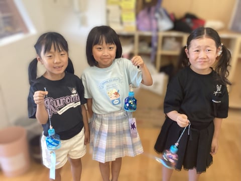 「完成!はいチーズ!」頑張って作った風鈴と一緒に記念撮影をしました!