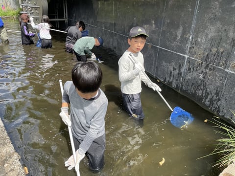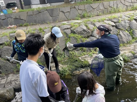 安春川での生物調査では、実際に自分たちで川に入り生物を捕獲します。