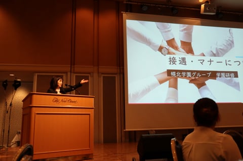 接遇研修では、正しいマナーや相手視点の対応などをレクチャー。その後実例として、普段 園で起こりえる場面などを再現。客観的に見ることで、相手側の気持ちや視点を知る、違いがあることを認識または再認識する機会としました。