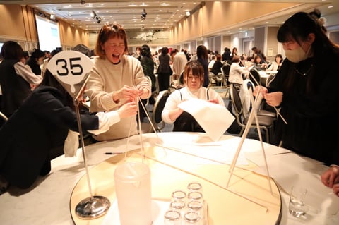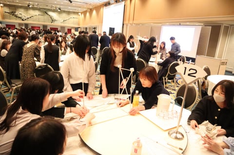 チームビルディング研修では、チームで取り組むワークショップを実施。1つの答えではなく、いろいろな答えがある課題について、「どうしたら?」をたくさん考え、話し合い、思考錯誤しながら取り組みました。工程も結果もチームごとに同じものは1つもなく、その違いもまた気づきに。
