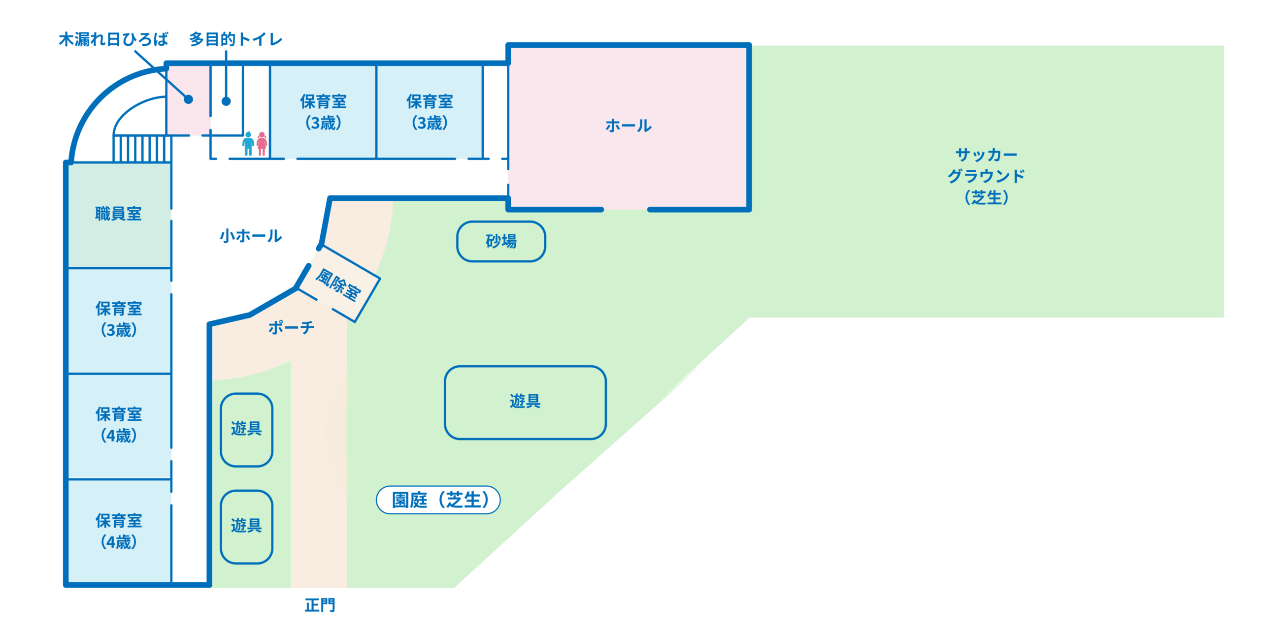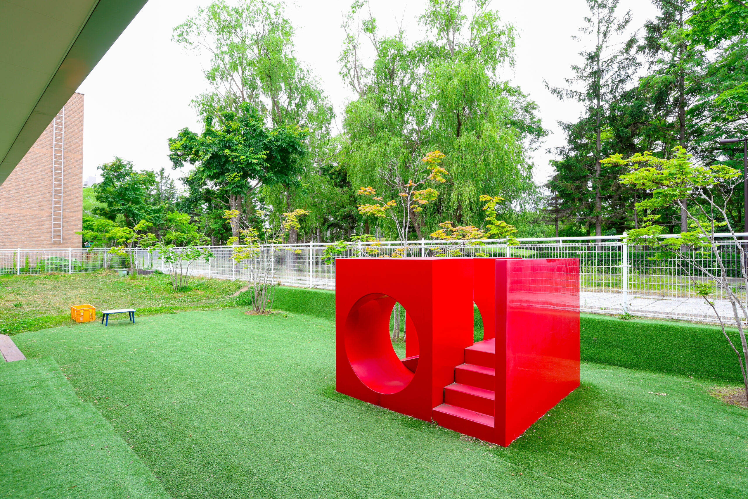 1階の芝生の園庭は玄関を通らずにすぐ園庭に出られる造りになっています。外への導線がスムーズなので、お部屋あそびでの興味や集中を途切れさせずに外あそびへ繋ぎ、あそびの幅を広げています。