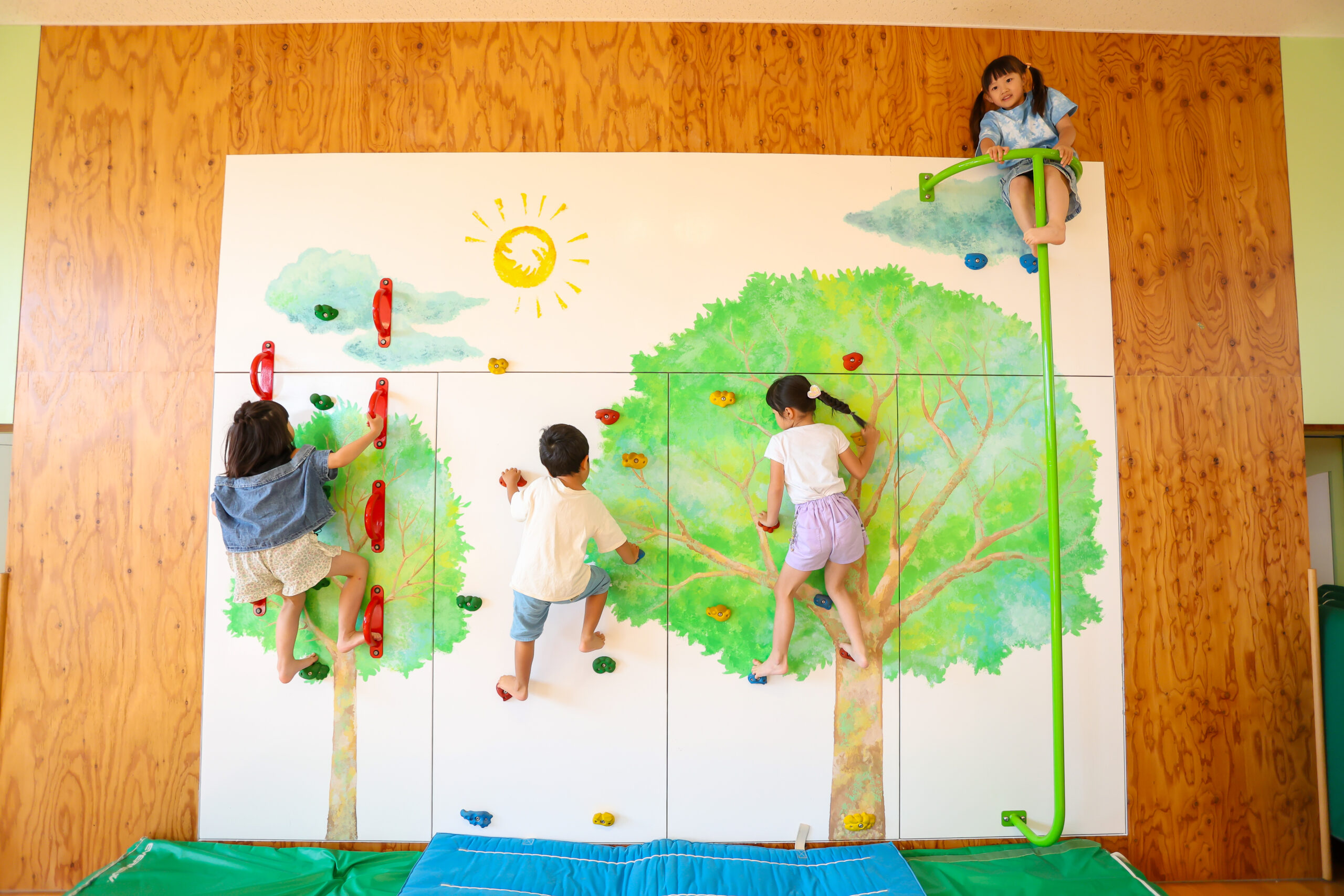 大型ブロックやトランポリン、ボルダリングなど保育室ではできないあそびができます。なかでもボルダリングは子どもたちに大人気の遊具です。外部講師による体育あそびやダンスあそび、行事の練習として発表会やドッヂボールなど一年中活用しています。