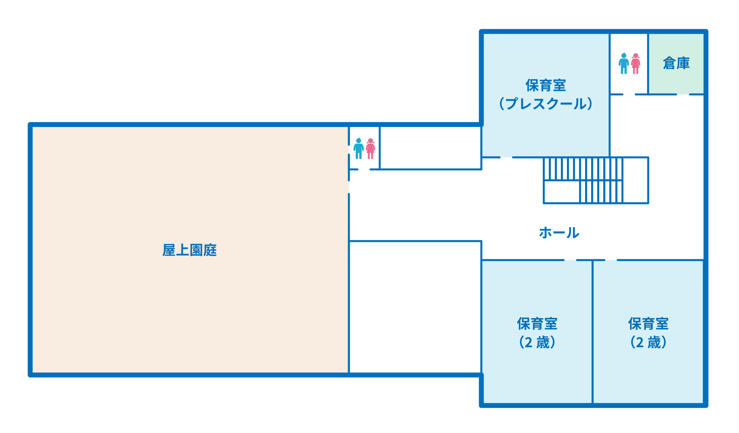 2階から繋がる屋上園庭は、安全性を考慮し全面をゴムチップで舗装しました。安全を確保しながら、ボールあそびや三輪車などのほか、夏には水あそび、冬には雪あそびなど季節に合わせたあそびを楽しみます。