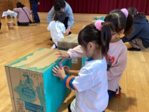 作った飾りを段ボールに貼ります。さぁ何が出来るかな。