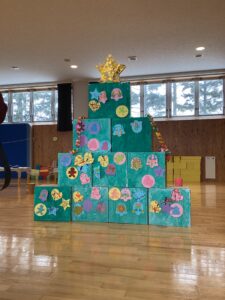 みんなが作った段ボールがなんとクリスマスツリーに変身!何か足りないね…あっお星さま☆先生と一緒に飛んできましたー。