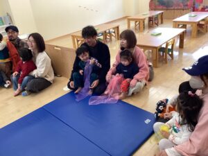 シフォン布を使ったわらべ歌『にぎりぱっちり』。丸めてそっと手を開くとふわっと布が広がりましたよ。