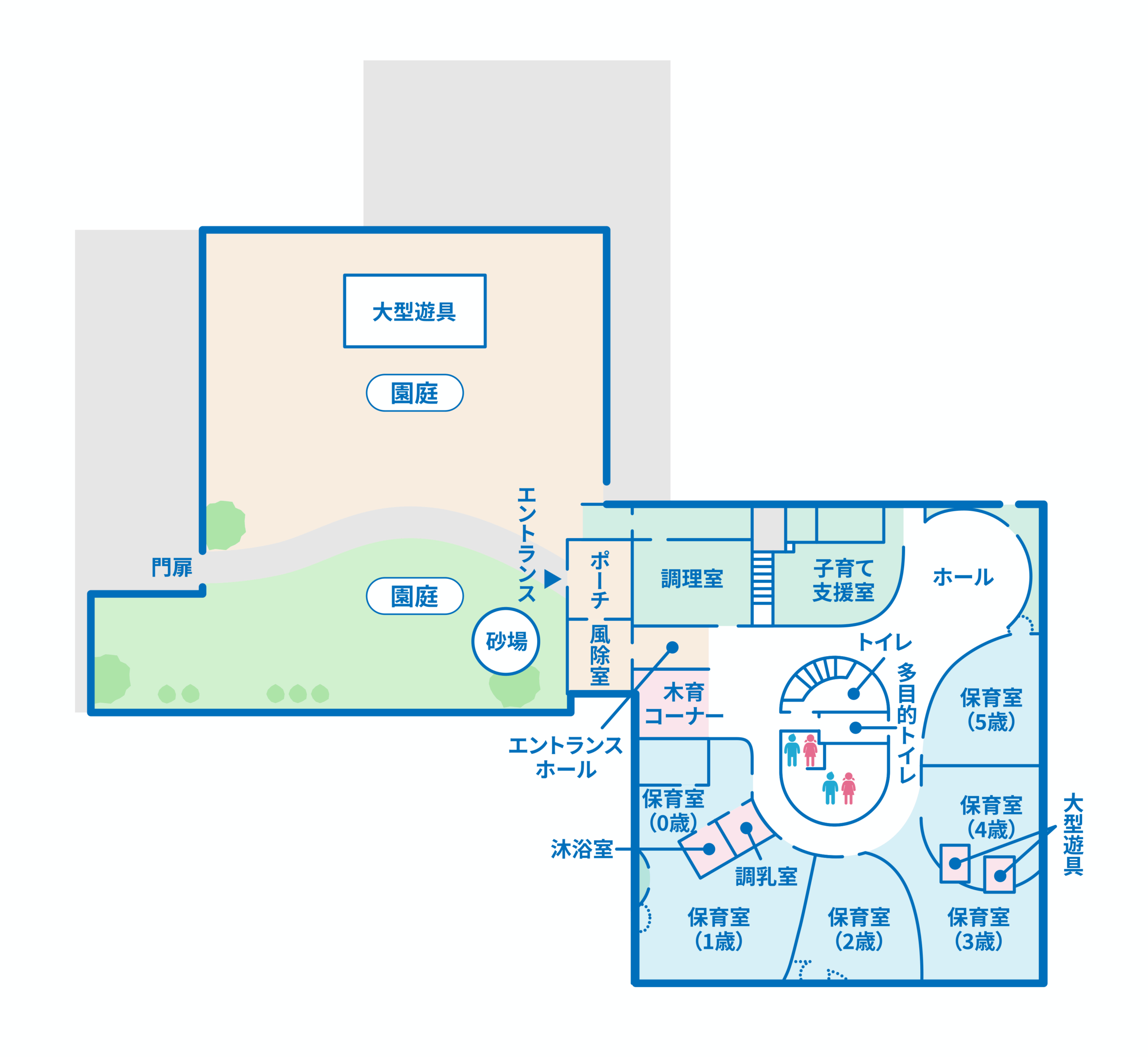 - ①園舎は解放感がある「小さなコミュニティー」