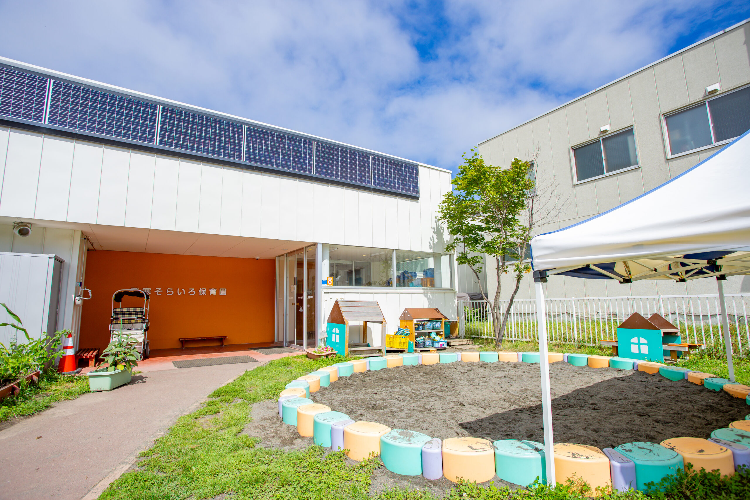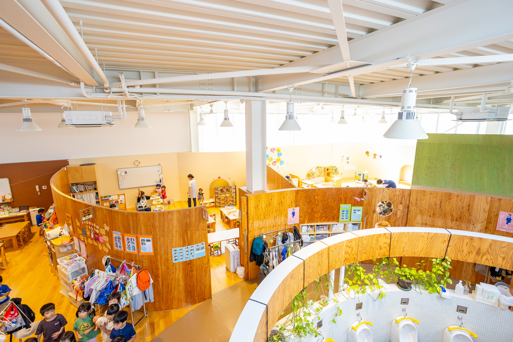 おうちのような造りのエントランスをくぐると、曲線になっている回廊廊下やかわいらしい街並みのような風景にワクワクします。吹き抜けで開放的な保育室のほか、子どもたちの好奇心をくすぐります。園のどこにいても、いつも子どもたちの楽しそうにあそぶ声や笑い声が響いています。