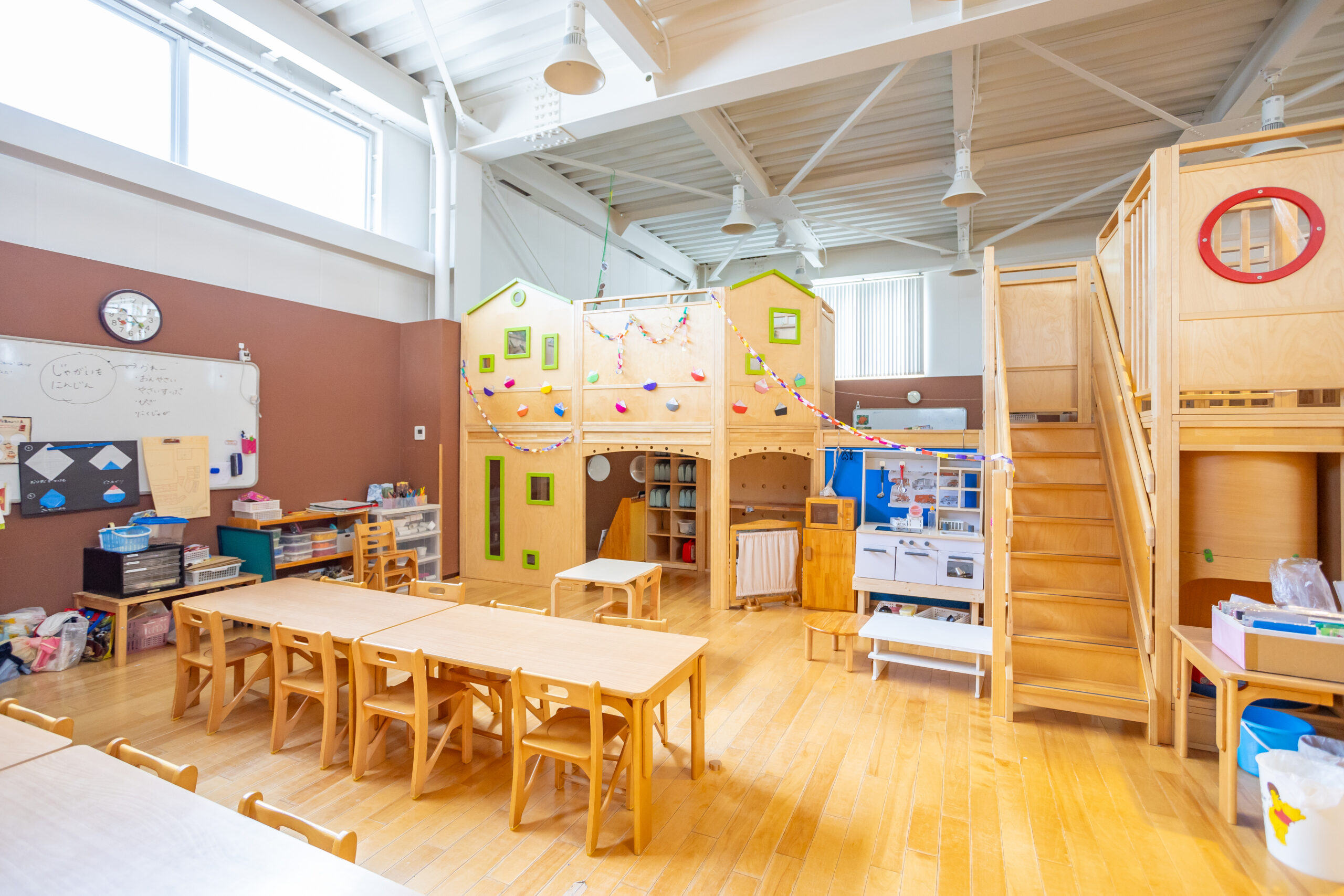3歳児と4歳児クラスの間には仕切りはなく、大型遊具を設置しています。子どもたちにとって秘密基地のような空間として、おままごとや乗り物に見立てたりできる人気の場所です。