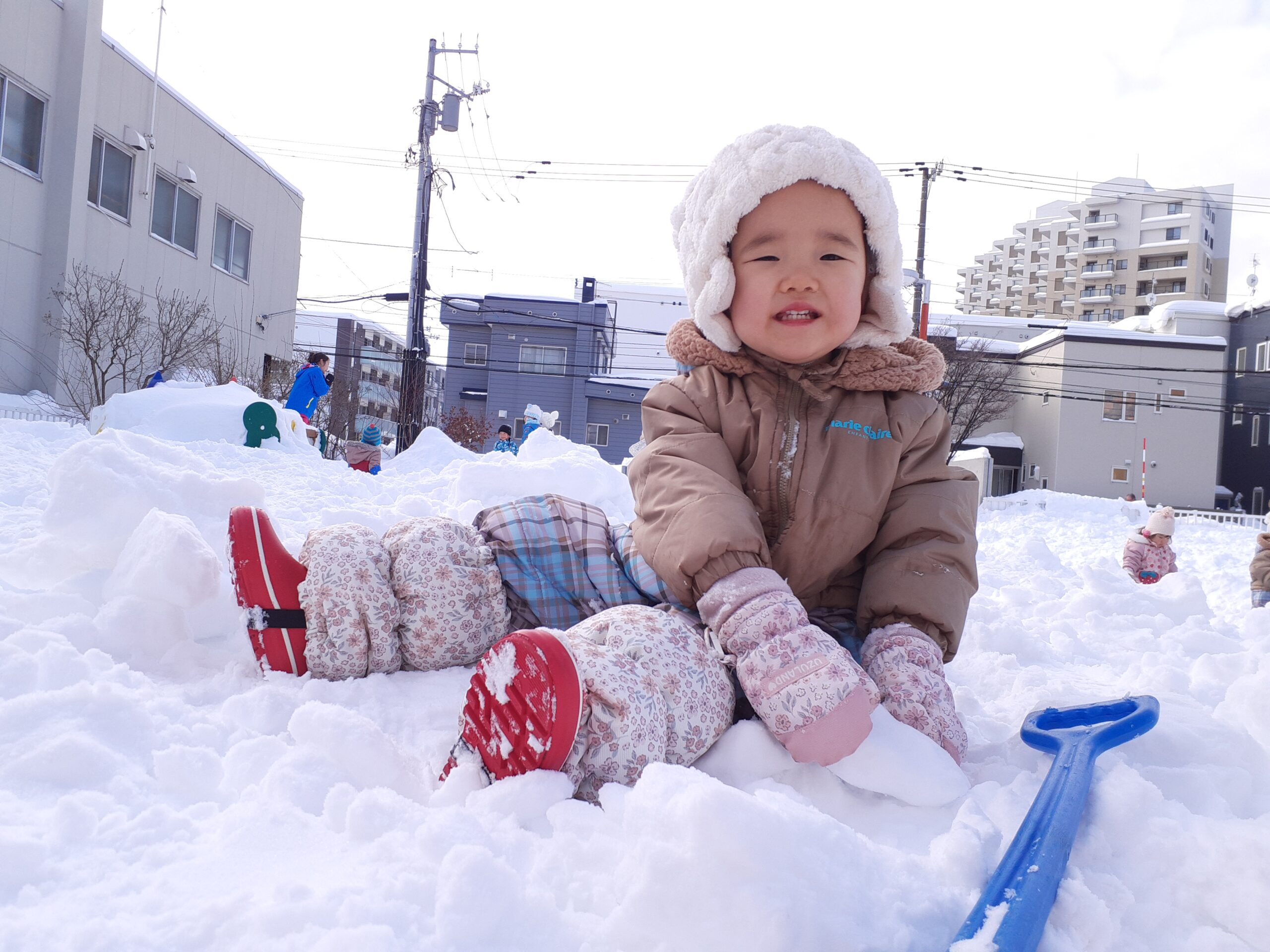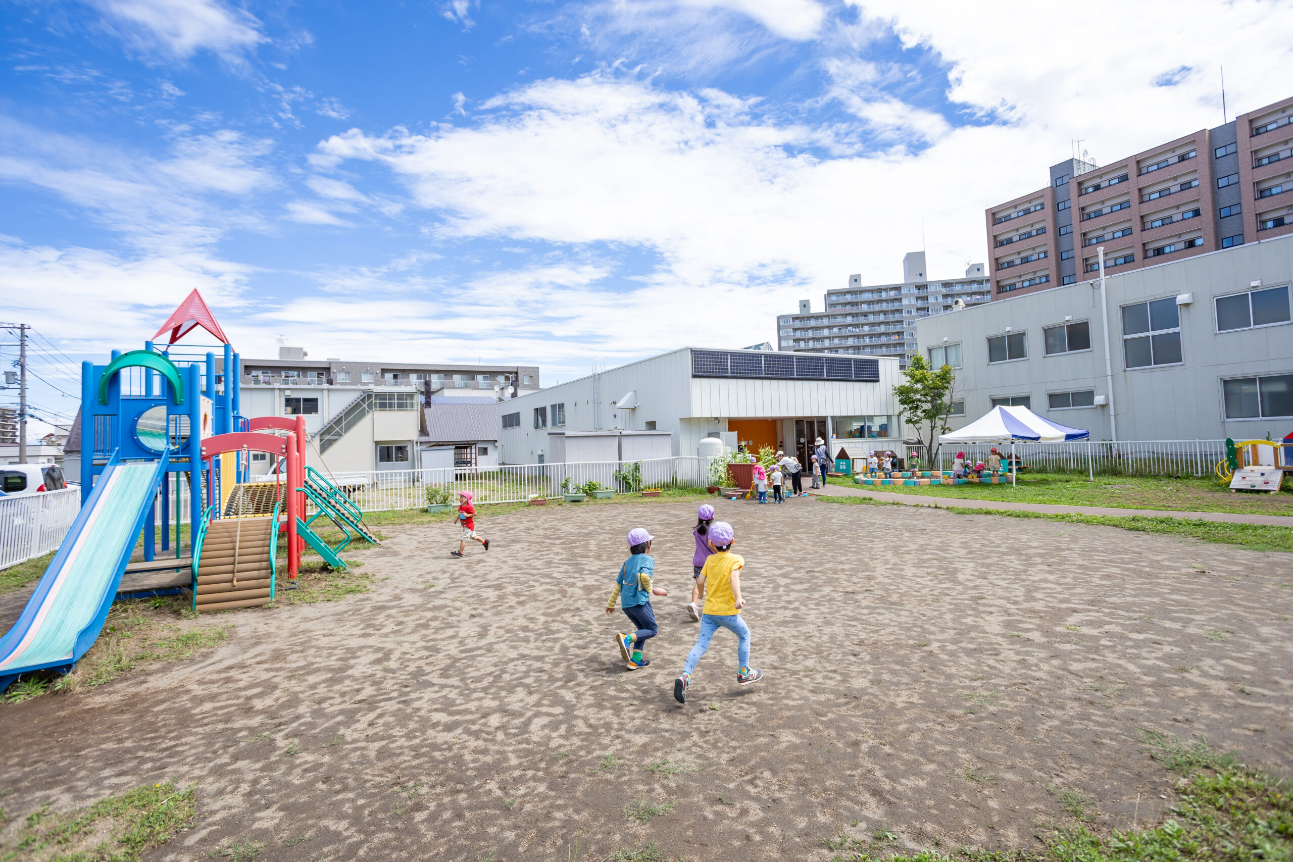 駆けまわったり、砂場や大型遊具で遊んだり、異年齢で関わりながら、それぞれが好きなあそびを見つけてのびのび楽しんでいます。冬には雪あそび、夏には水あそびなど、一年を通して季節を感じるあそびを積極的に行っています。