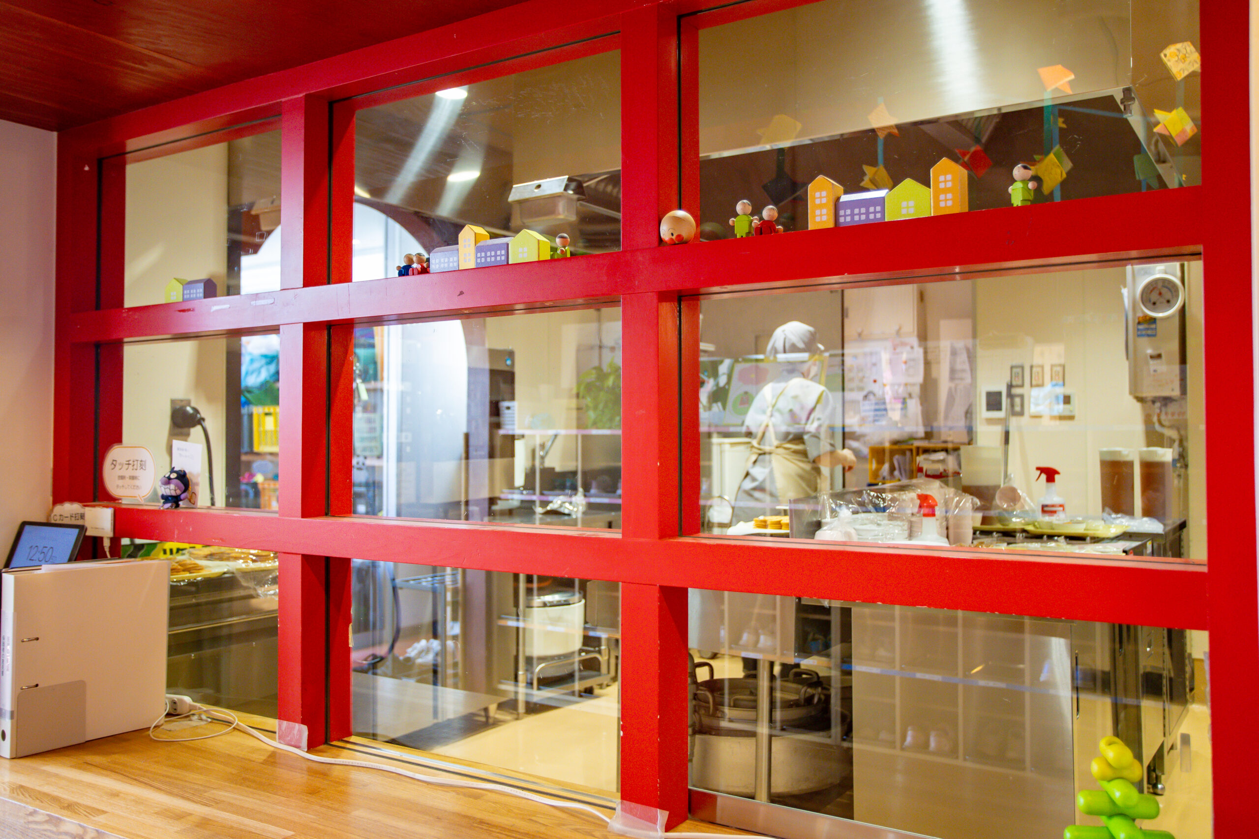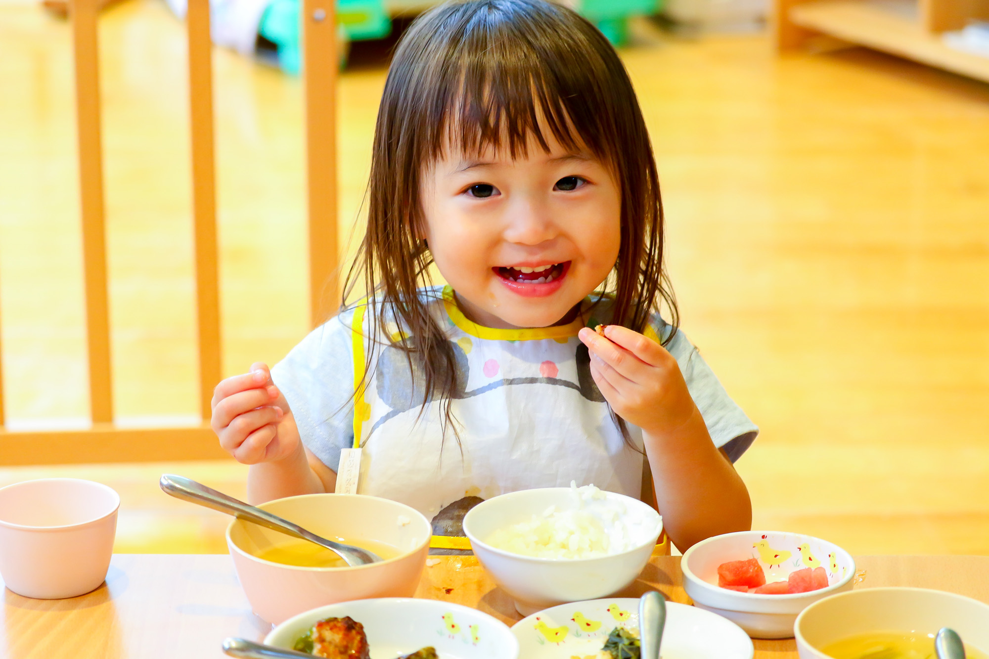 玄関を入るとすぐ、ガラスの窓で仕切られたキッチンがあります。給食を作る様子を見たり厨房の先生とコミュニケーションをしたり、日常的に食を意識する環境づくりをしています。給食提供はもちろん、子どもたちが育てた野菜を使ったクッキングなど厨房と連携した食育も行っています。