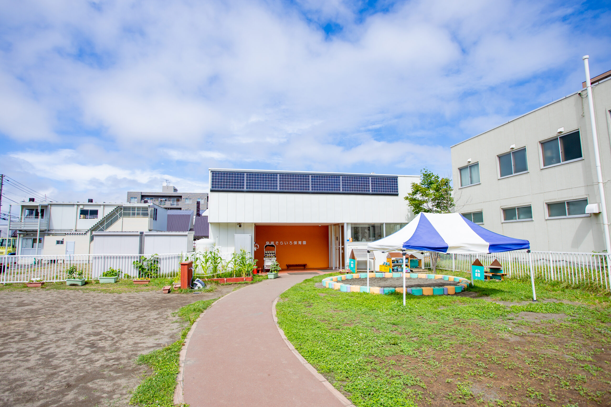 エントランスから園舎までのスロープ両サイドには広々とした園庭があります。