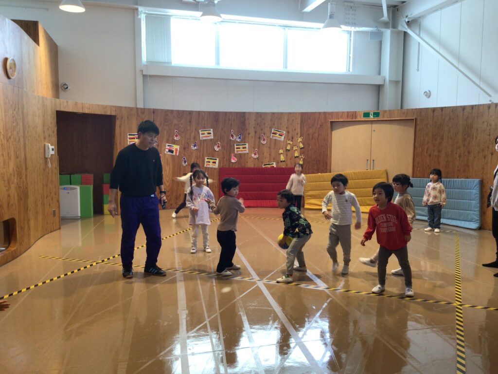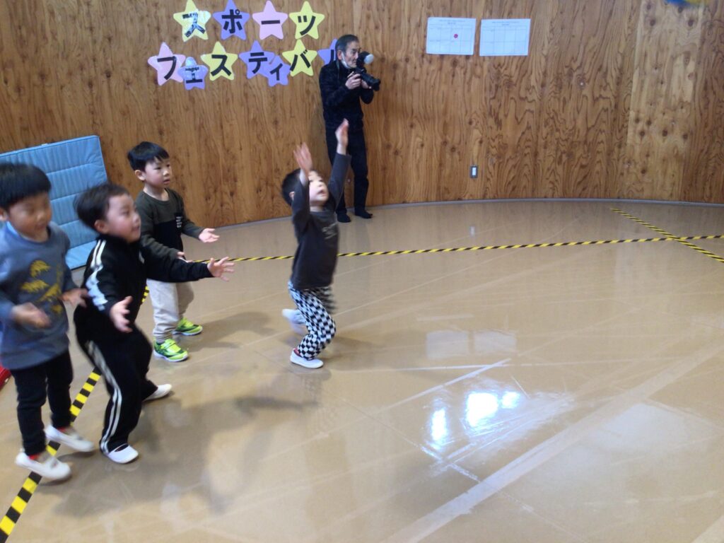 2月13日に、ぱんだ組、もも組のスポーツフェスティバルが開催されました。クラスを2チームに分けて、クラスごとに行いましたよ。