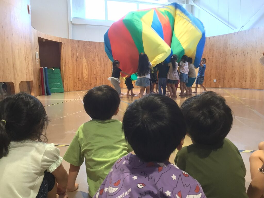 ももぐみは初めてのバルーン!大きな布がみんなの力でふわっと宙に舞ったり、ボールを高く飛ばしたり、いろいろな形を作ります。