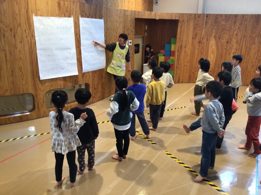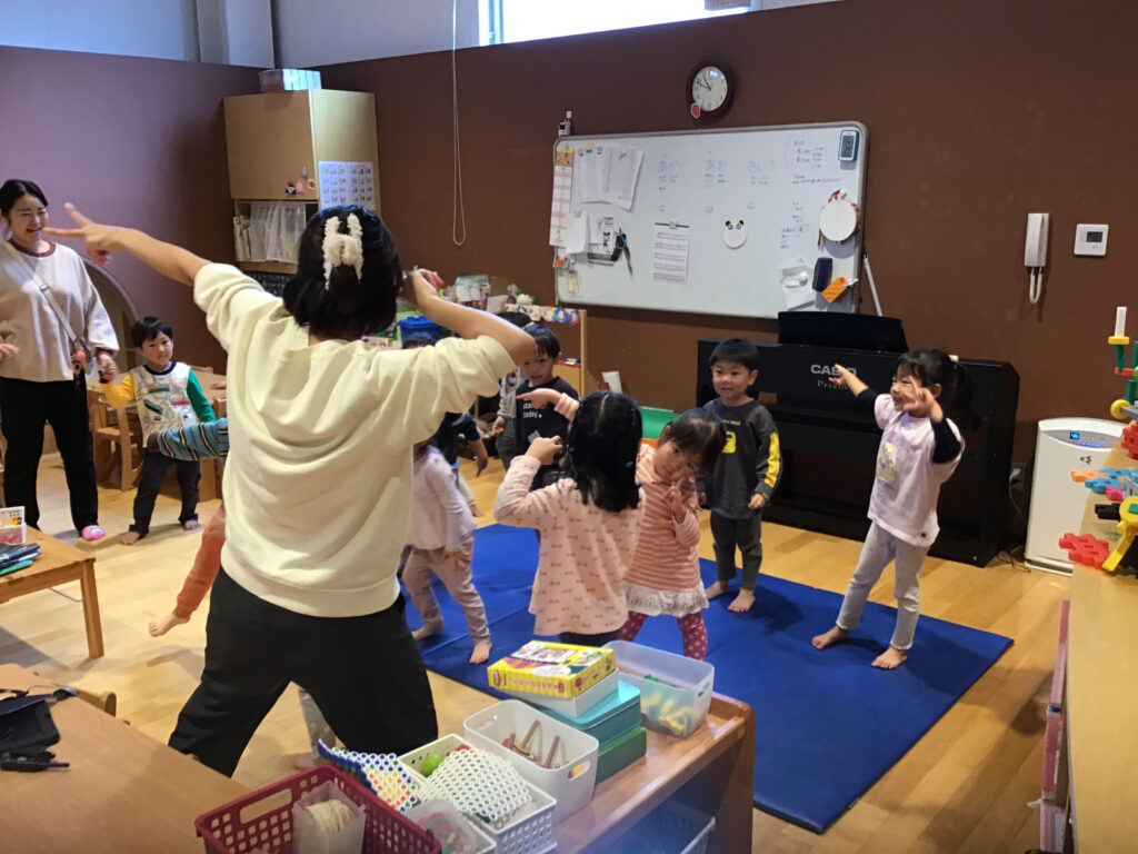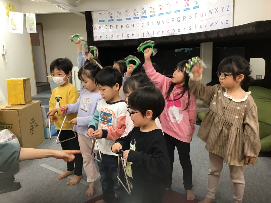 取り組みを重ねるたびにどんどん息が合うようになり、音色もどんどん綺麗になっていきました。保育園内に元気な歌声や綺麗な楽器の音色が響き始めると乳児クラスも含め、色々なクラスが見学に訪れ、気が付くとさながらミニ発表会になっている事も多くなりました。