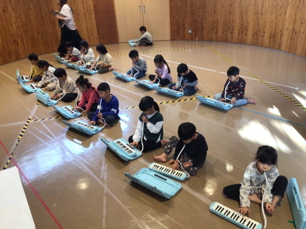 4歳児クラスもも組と5歳児クラスばら組はうた、遊戯の他に器楽にも挑戦します。