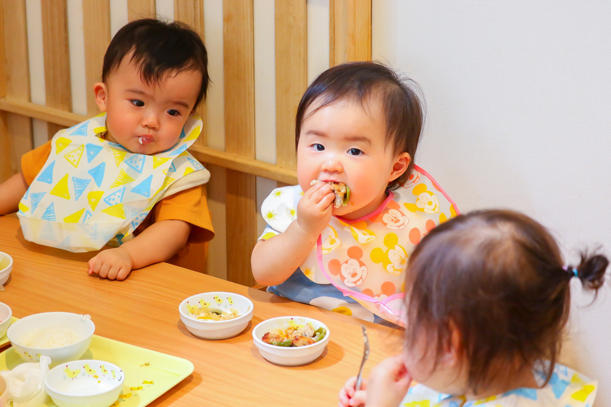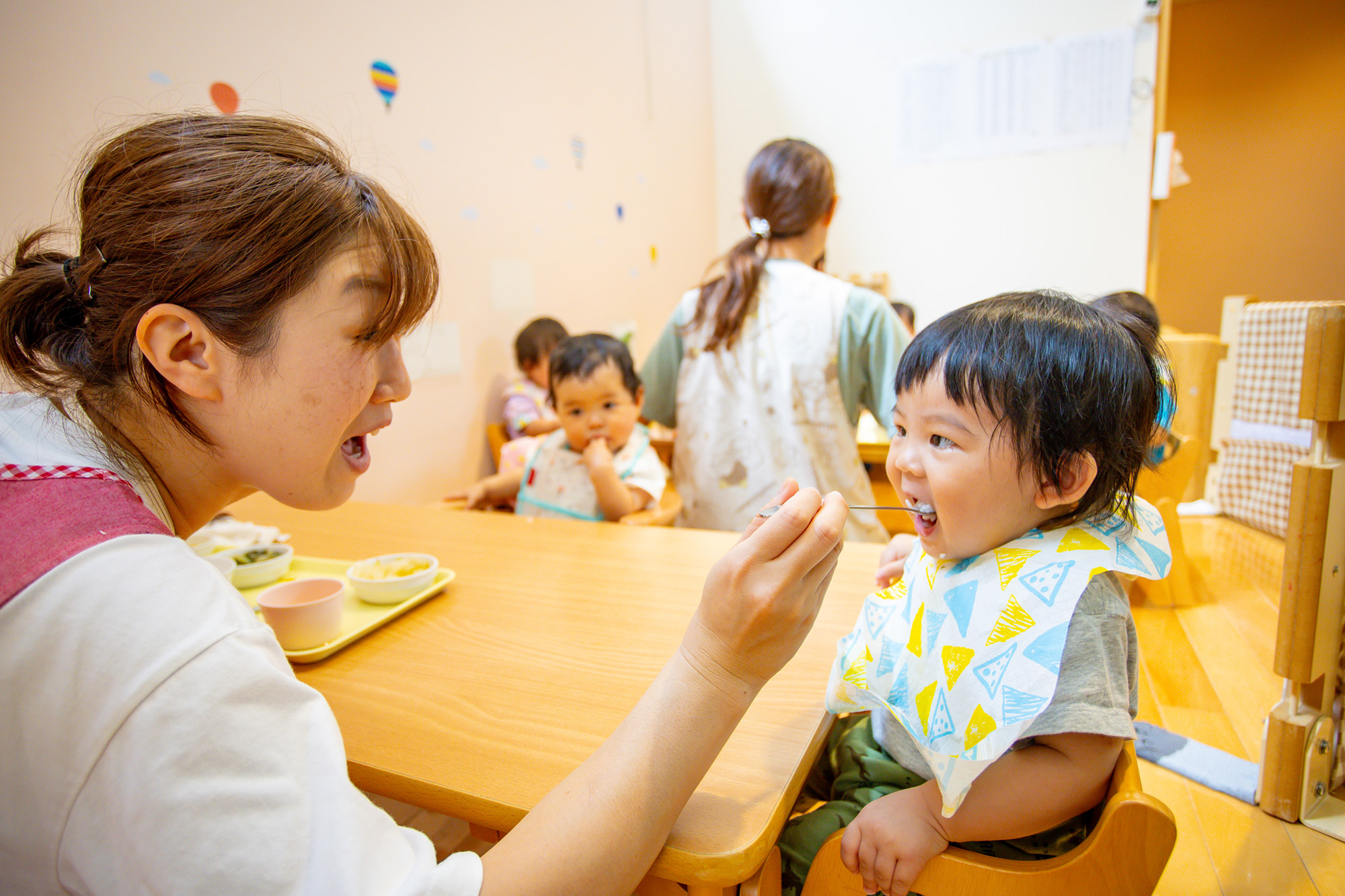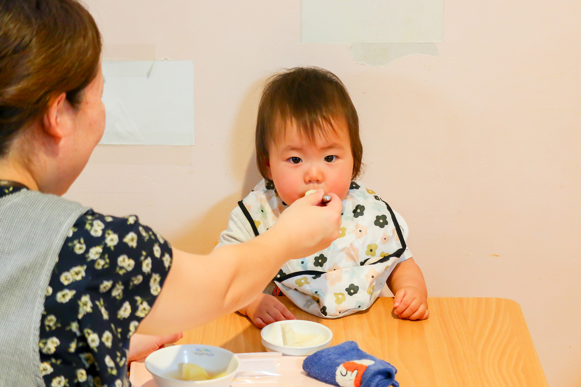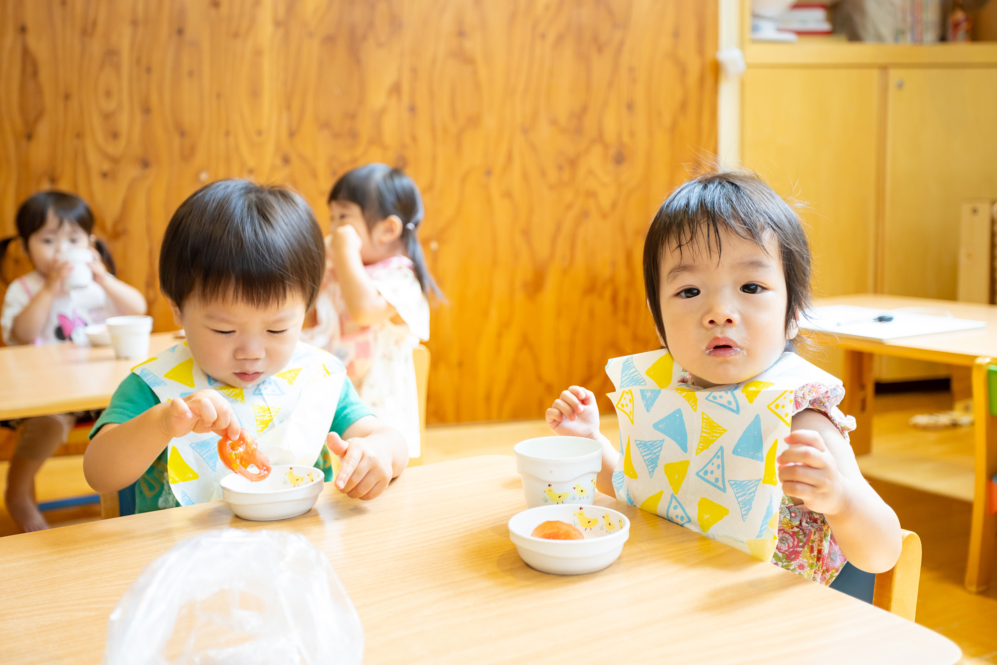 子どもたちの発達に合わせて咀嚼しやすい形・大きさで提供しています。安全に離乳食を提供できるよう、ご家庭での状況を把握するために保護者様には毎月面談のご協力をお願いしております。
