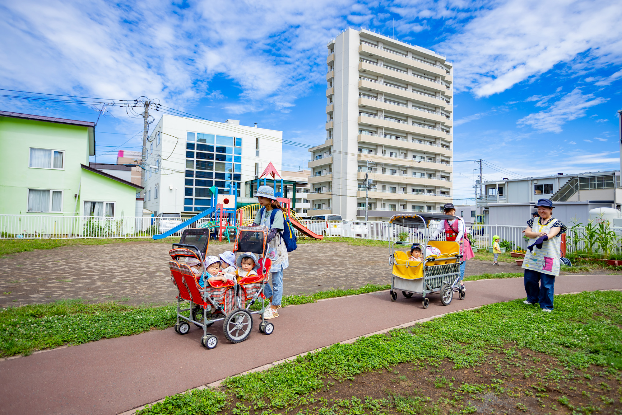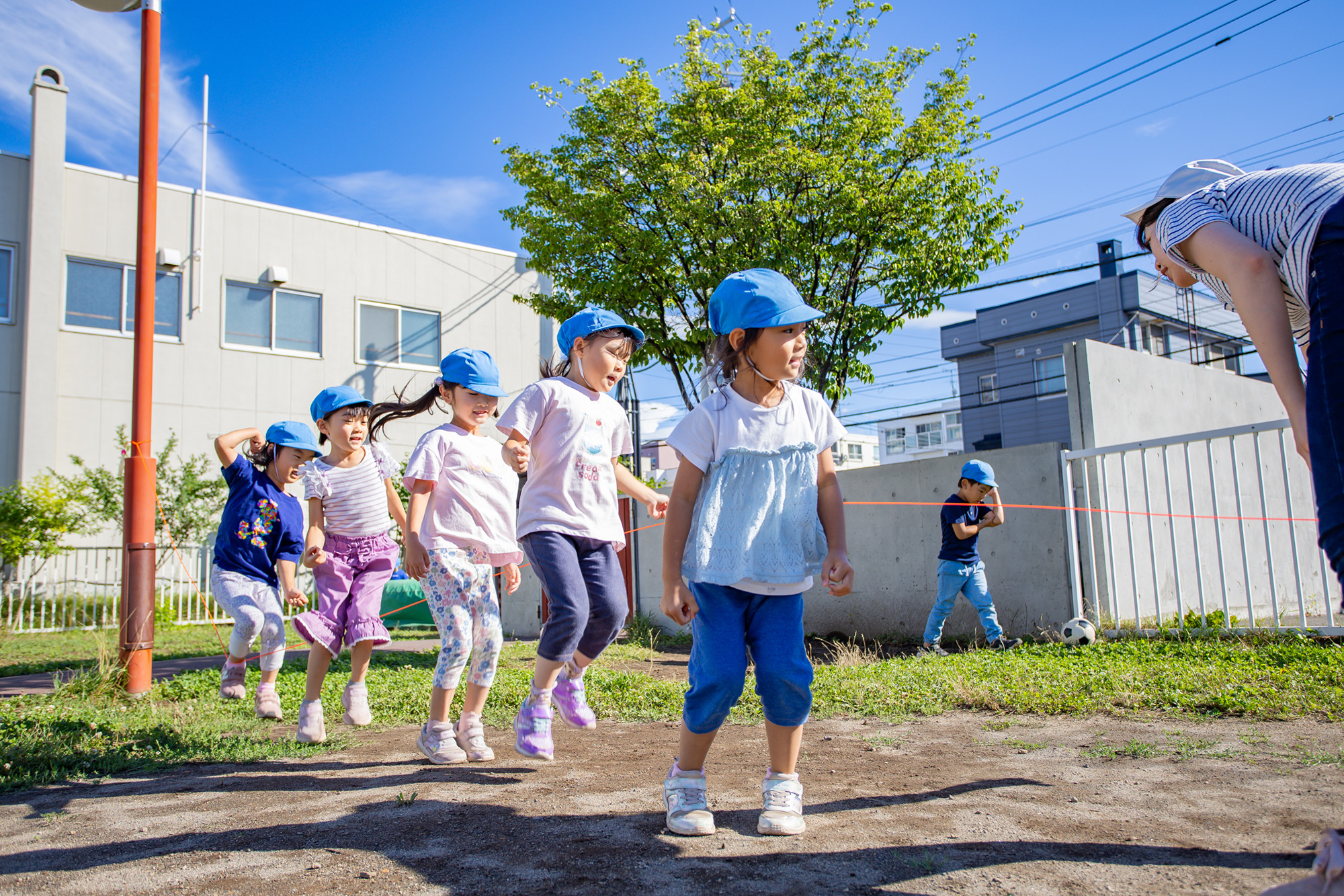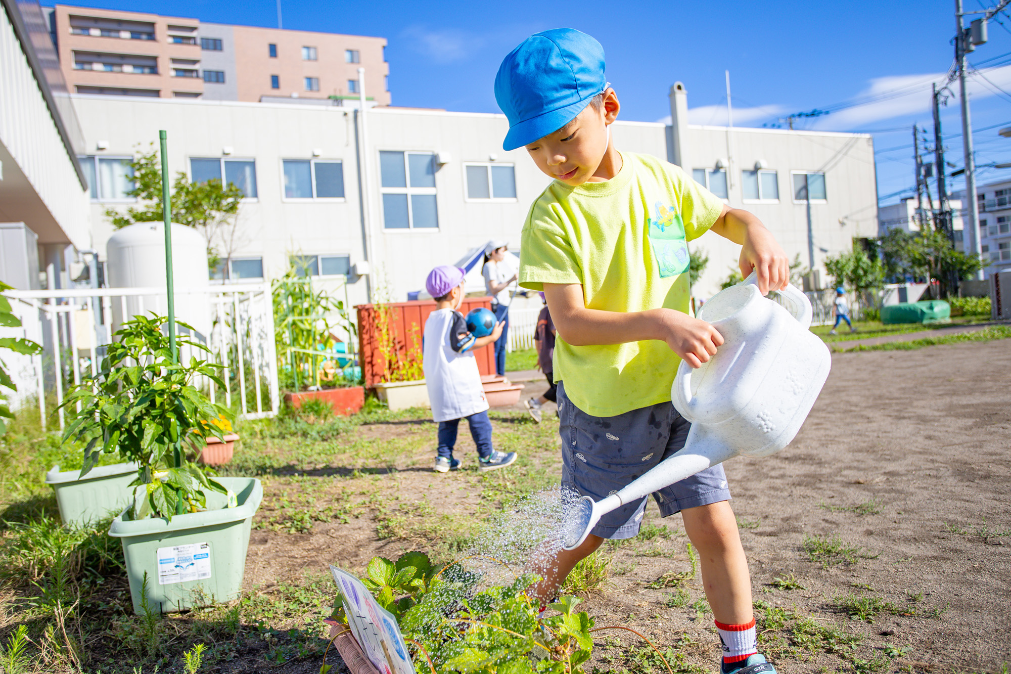 子ども達の興味関心、成長や発達に合わせた活動を行います。五感を刺激する室内あそびのほか、近隣の公園へのお散歩や園庭などで自然あそびを多く取り入れています。
