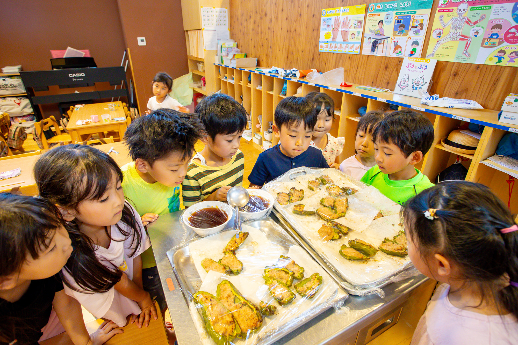 和食メニューを中心に、地元の食材や海外メニューも取り入れながら子どもたちが美味しく、幅広い味に挑戦できるようにしています。