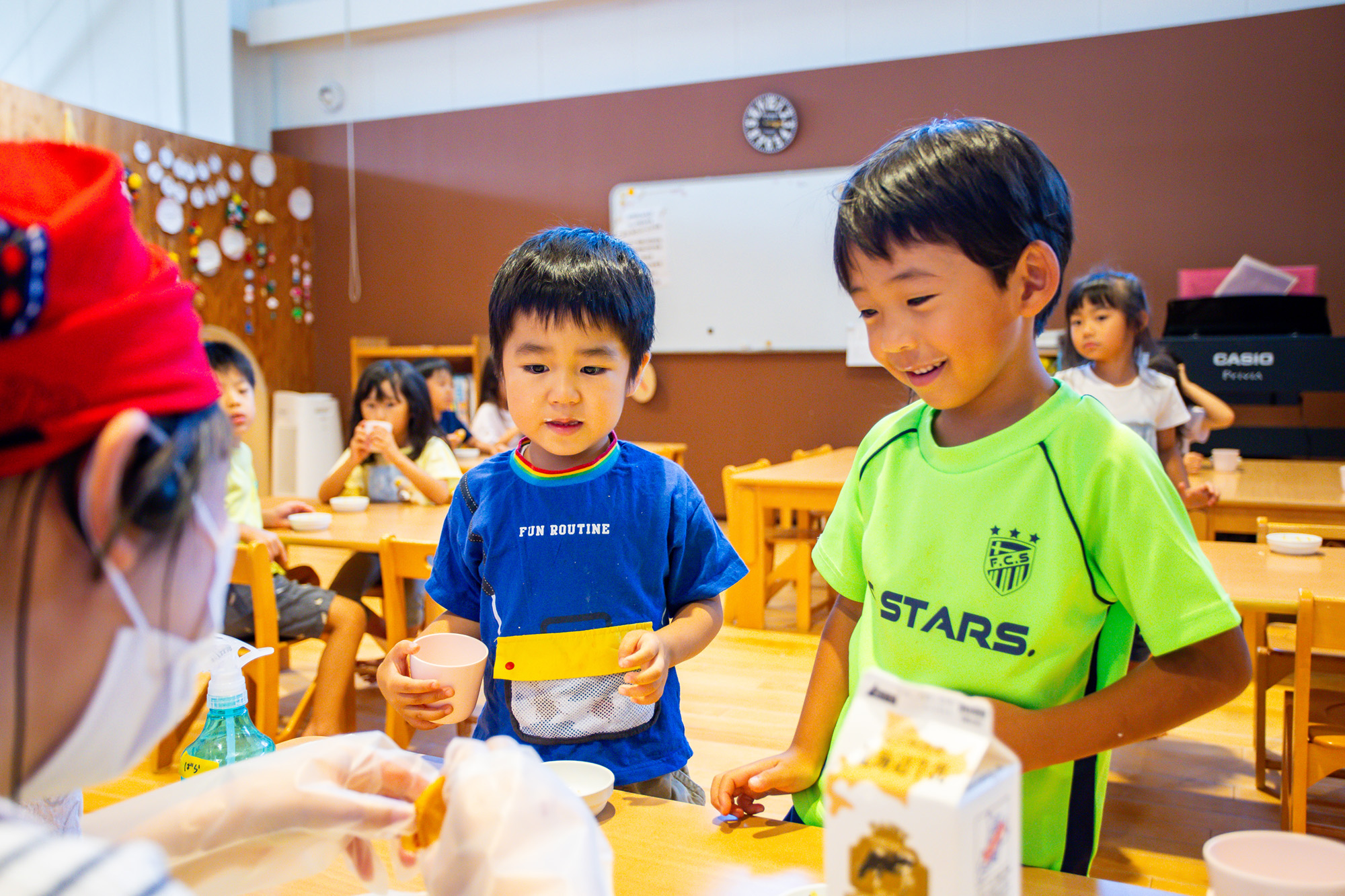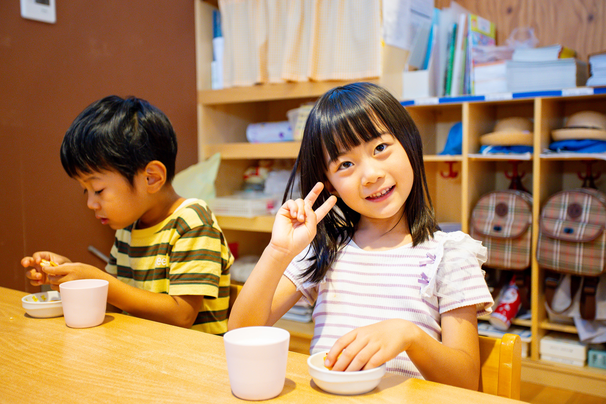 1日の活動とバランスをとりながら過ごします。延長保育ではおやつとお茶を提供しています。