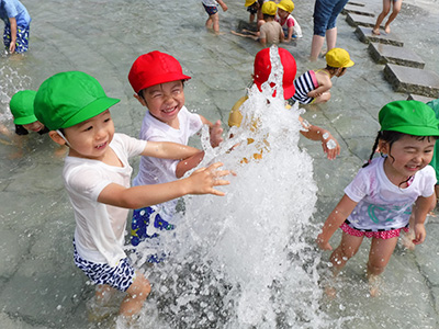- 北海道の短い夏を満喫する水あそび遠足では、近隣の水あそび施設まで園バスでお出かけします。