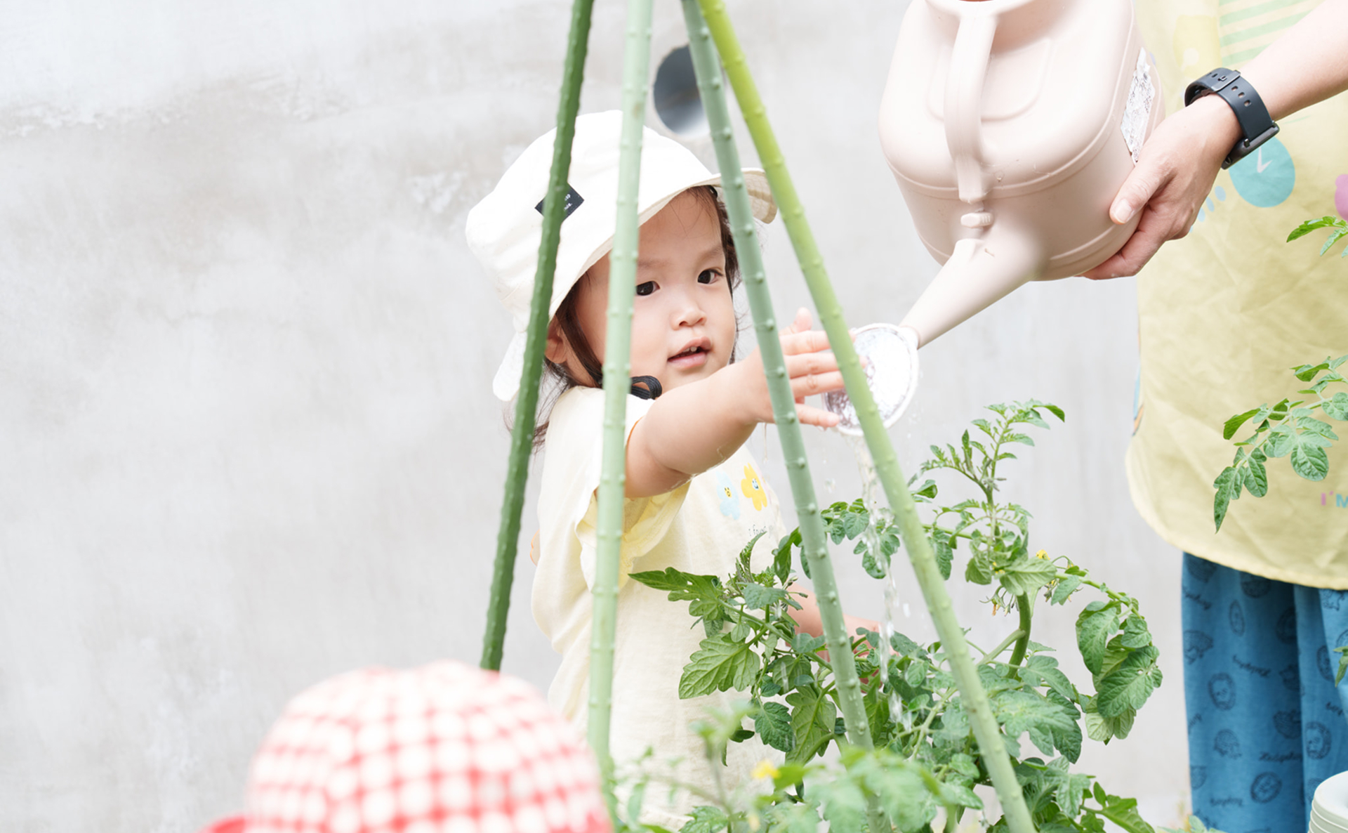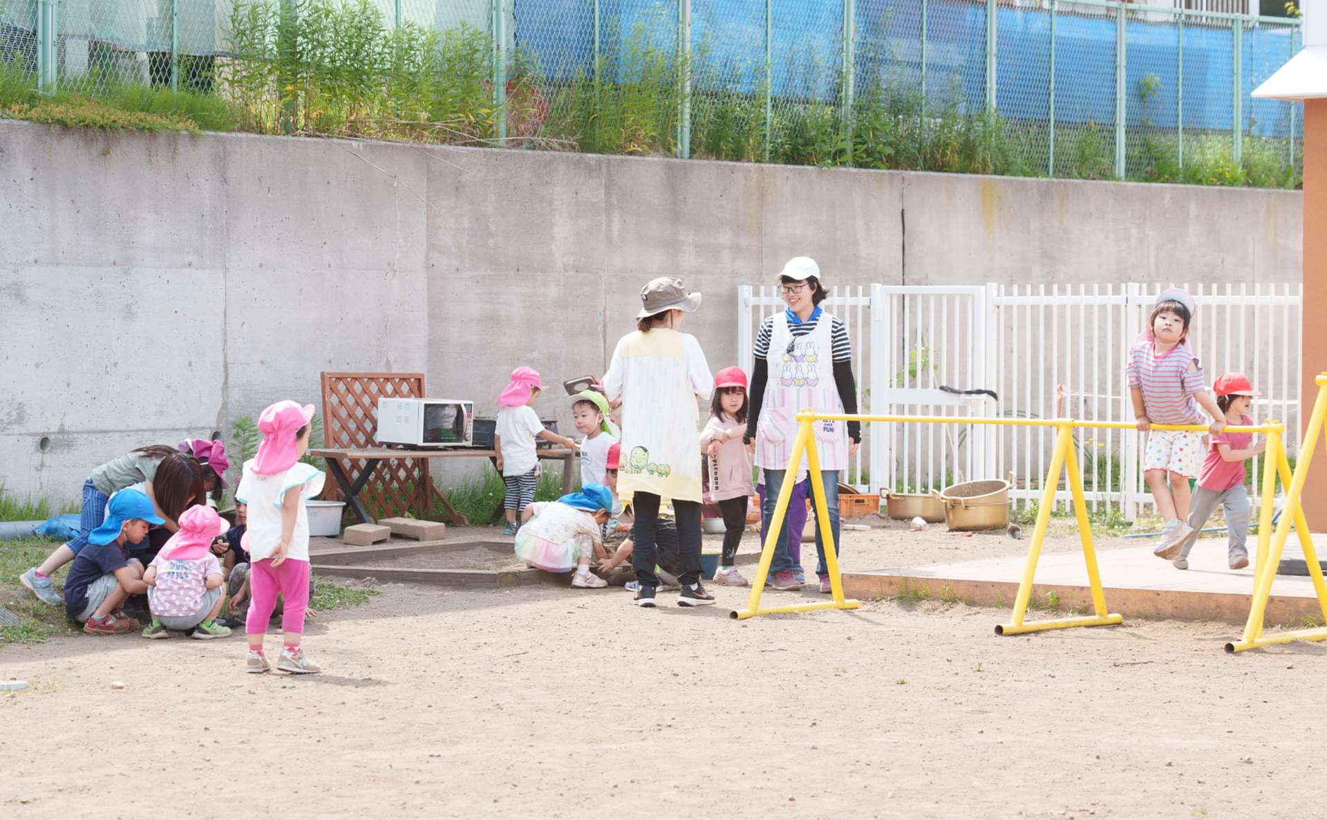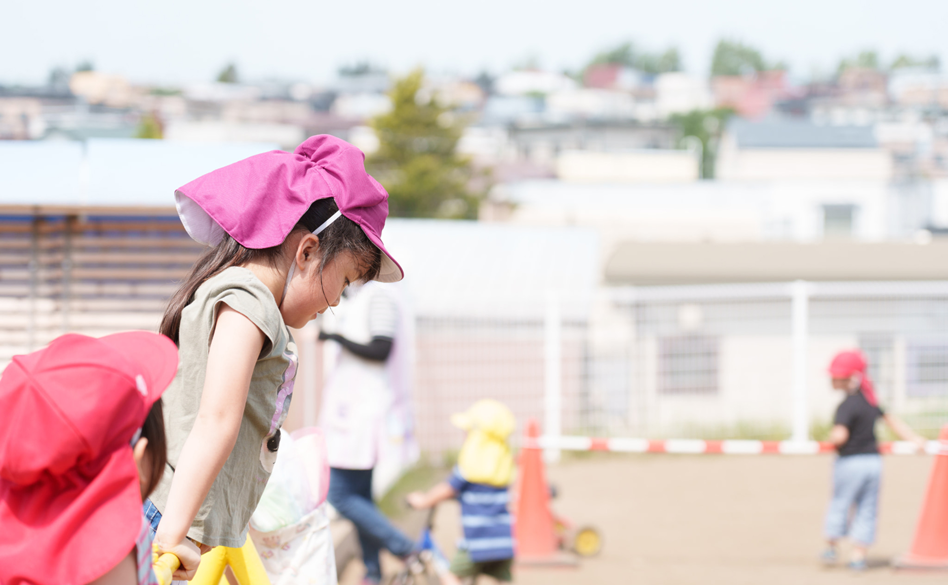 高台にある立地を活かしたひかり園舎の園庭は2階の保育室やホールから繋がっています。玄関を介さず、すぐに園庭あそびができる造りになっています。「今日は何をしよう?」キックバイクで競争したり、ボールあそびをしたり、おにごっこをしたり。おもいきり走り回れる広いグランド園庭で、いつもワクワクあそびを楽しんでいます。全体が見渡せるので安心。お友だちのあそびを真似したり、参加して一緒に遊んだりなどあそびが広がります。