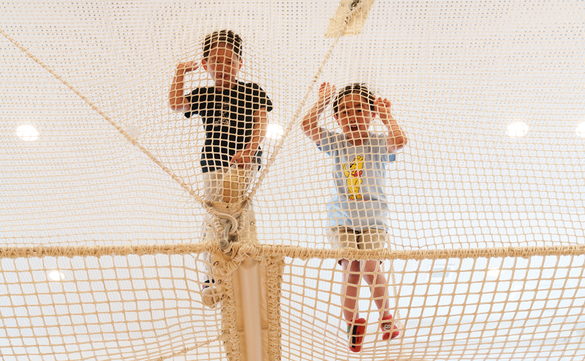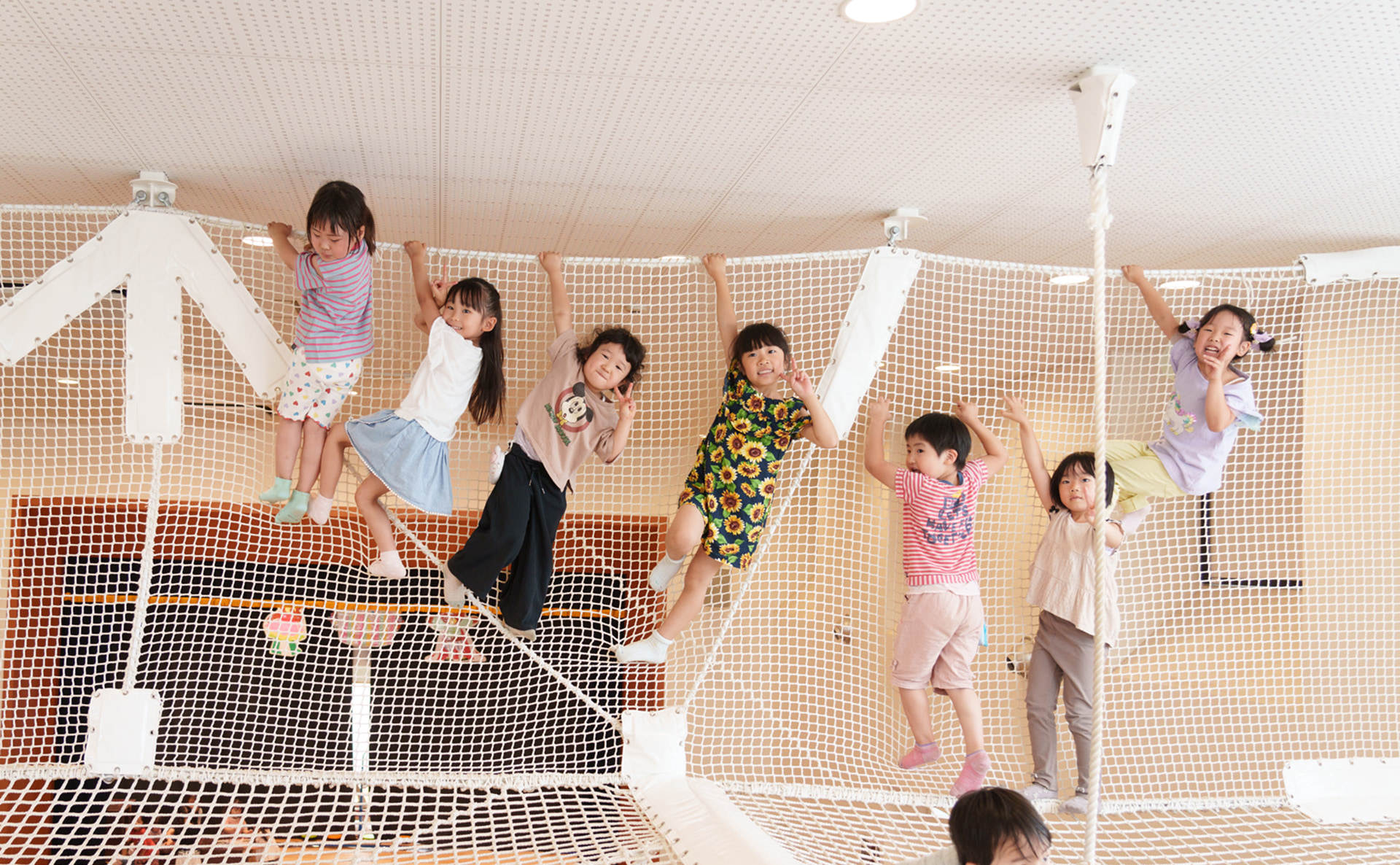 ホール内のある大きなネット遊具は、「ザイルの森」の名称のごとく、森の木に登るように、ネットの中を全身を使って登っていきます。登った先はホールが見渡せる中2階のようなスペースがあり、子どもたちにとっては秘密基地のようなワクワクする空間です。登りも下りも一方通行なので、自然に順番を守ったり譲り合いができています。遊びながら、全身の発達や握る掴むといった手指の使い方も自然に身についていきます。