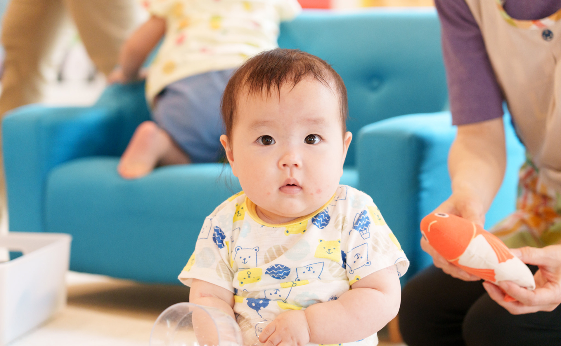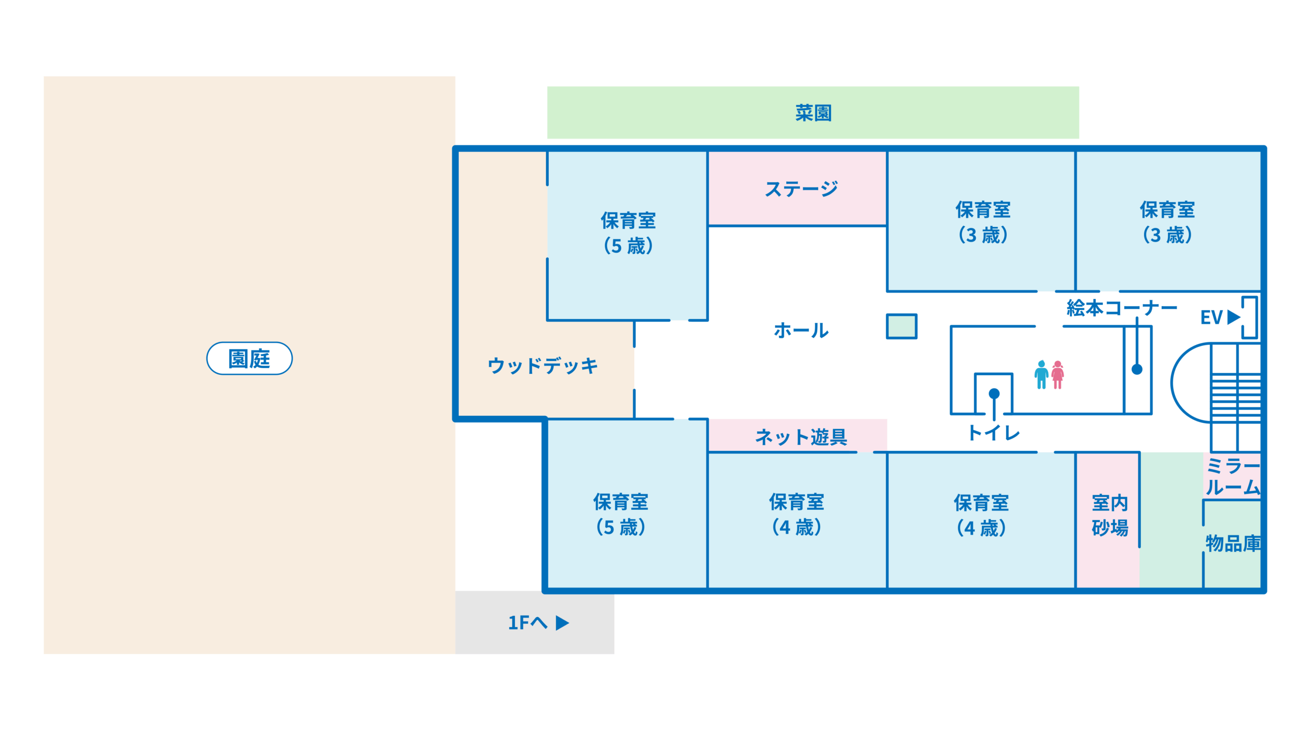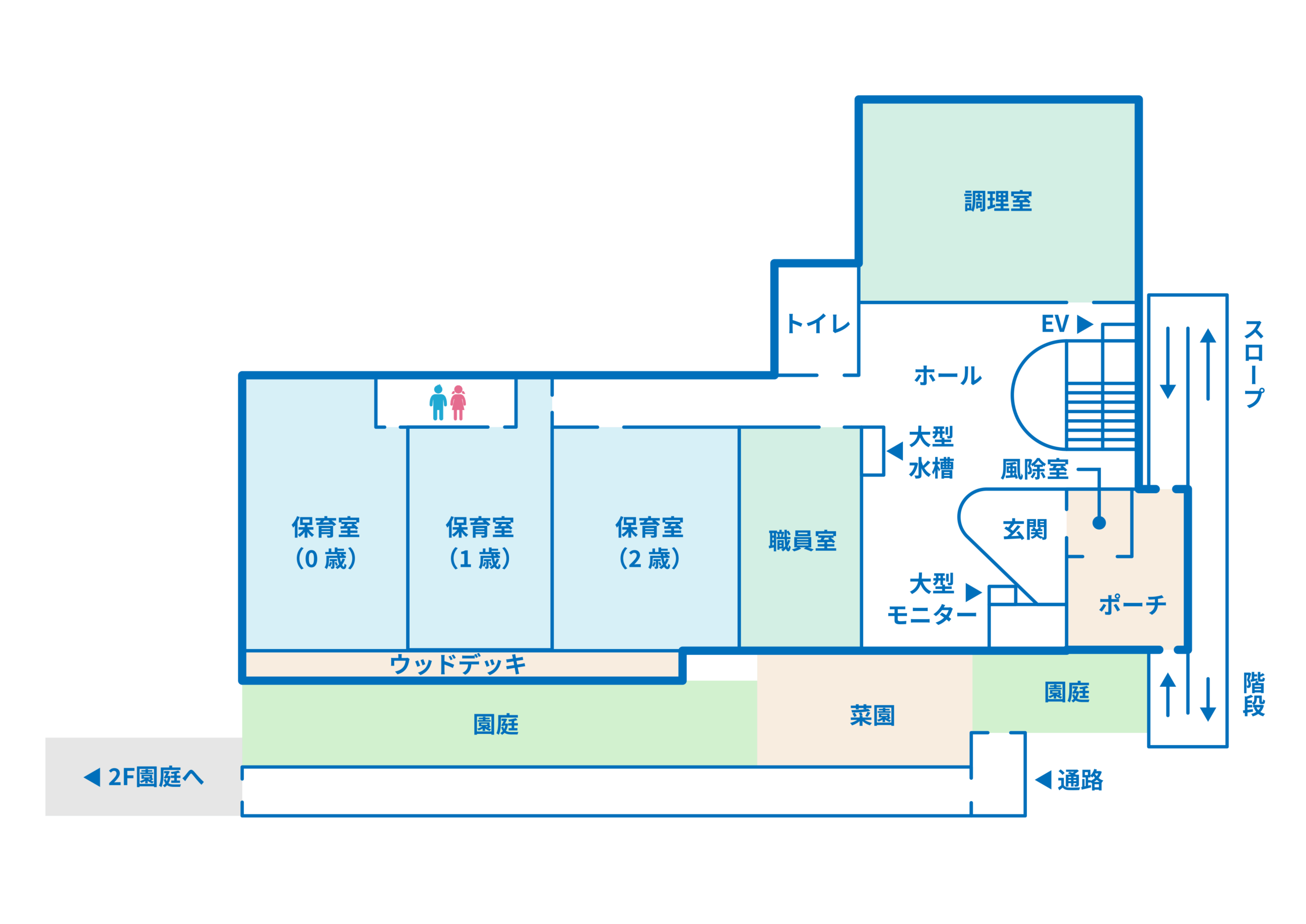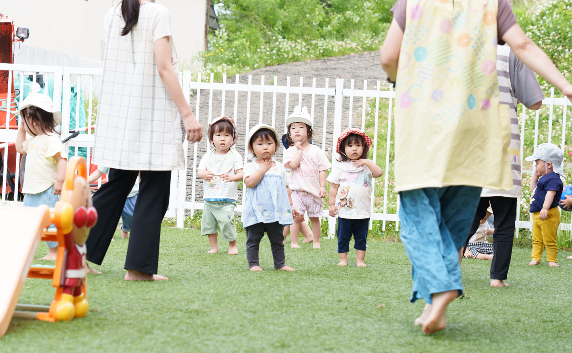 落ち着きのある温かでアットホームな雰囲気の1階には、ゆったり過ごせる乳児の保育室を配置しています。お部屋前には鏡の壁など好奇心をくすぐる仕掛けや、各お部屋には陽のひかりがたっぷり入るフルフラットの大きな窓があります。玄関を介さずにすぐに園庭あそびができるので、お天気の良い日はお部屋を飛び出して、芝の乳児用園庭で積極的に外あそびを楽しんでいます。