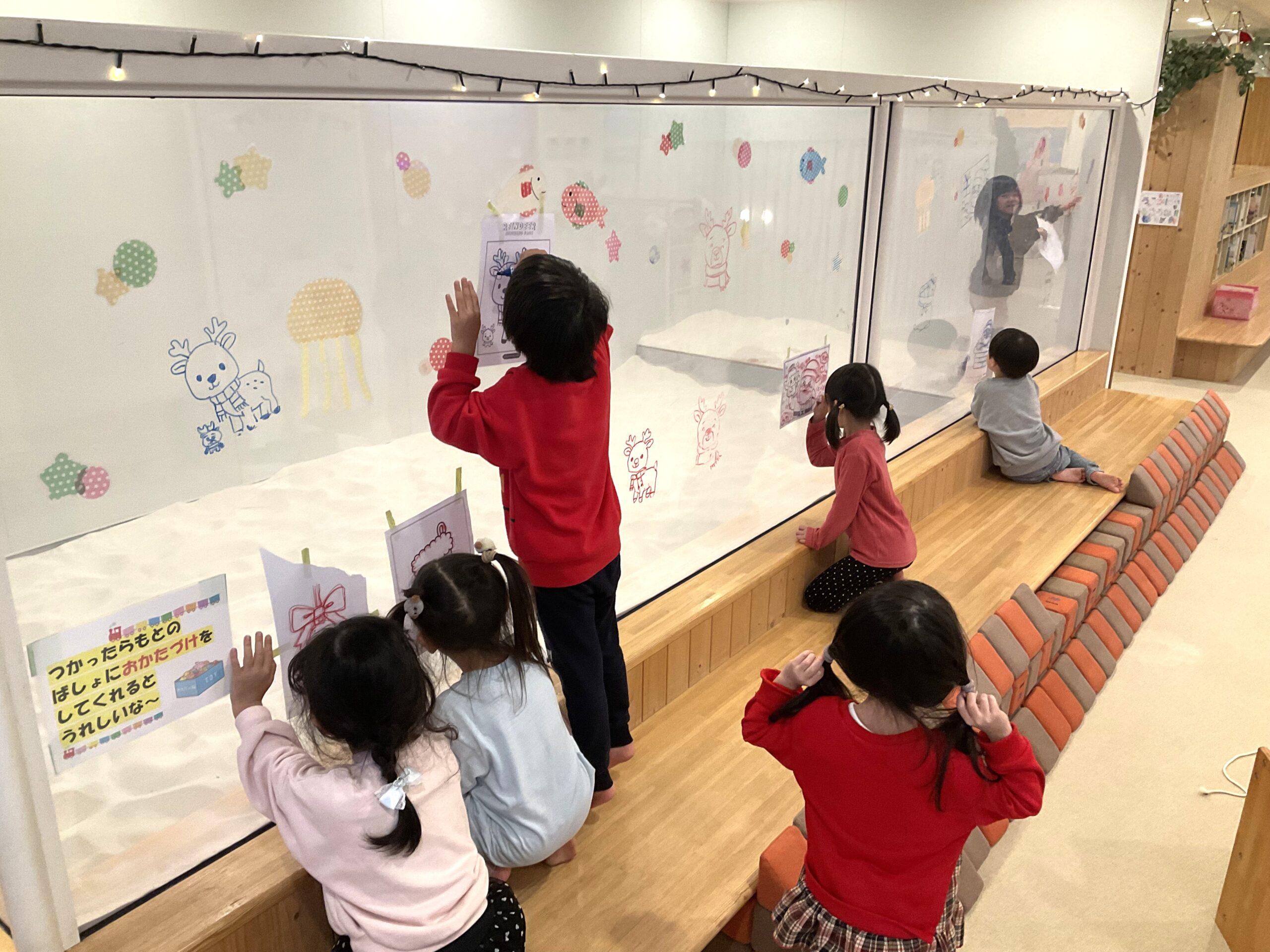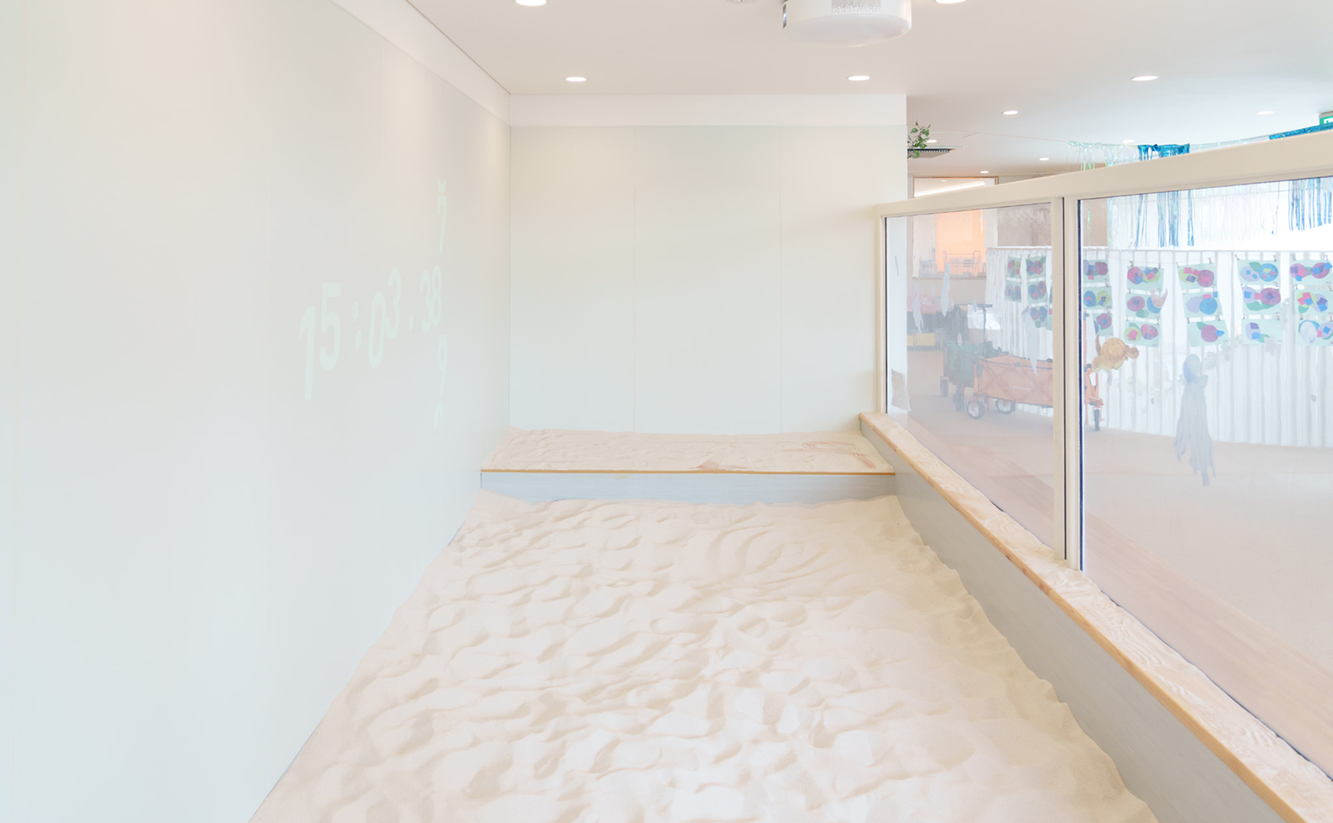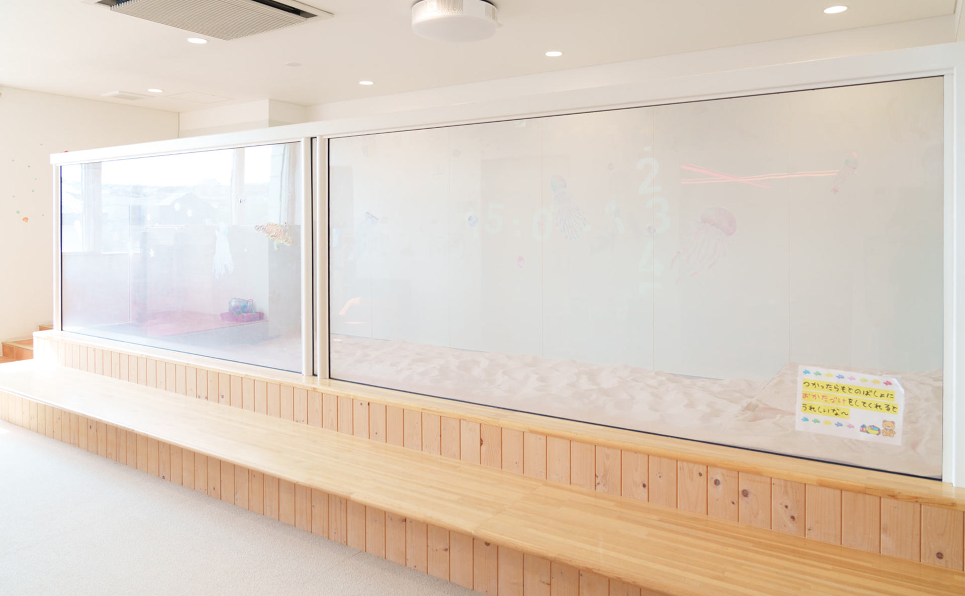 いつでも楽しめる室内砂場を設置しています。サラサラの白い砂で、お洋服にもつきにくいので、他のあそびの間に砂場へ!もできちゃいます。完全室内なので、季節や天候を気にせずに遊べます。砂場の向かいには鏡で囲まれたミラールーム。鏡の反射を楽しんだり、写したもの形が変わる万華鏡のような体験を楽しんだり!遊び方いろいろの人気のスペースです。