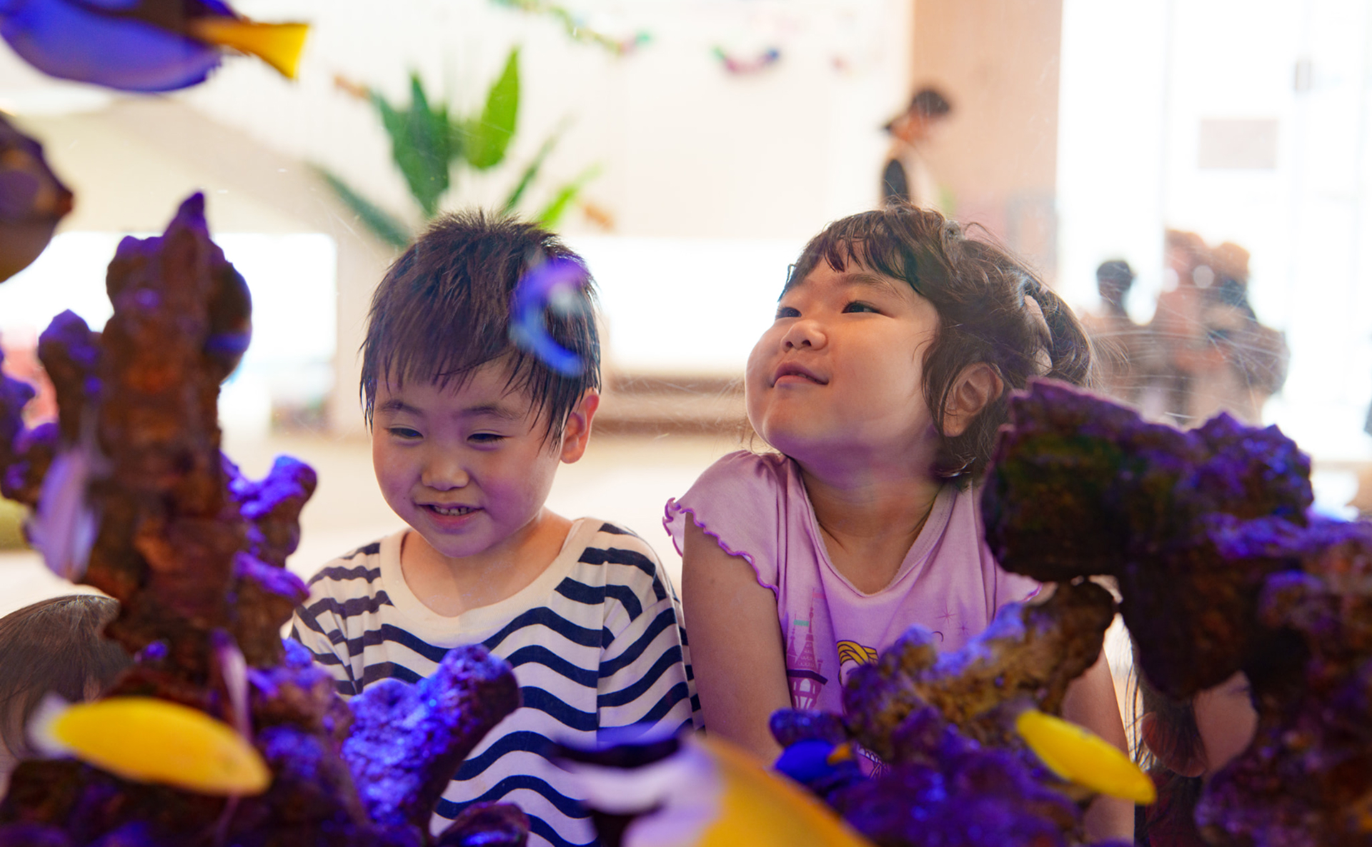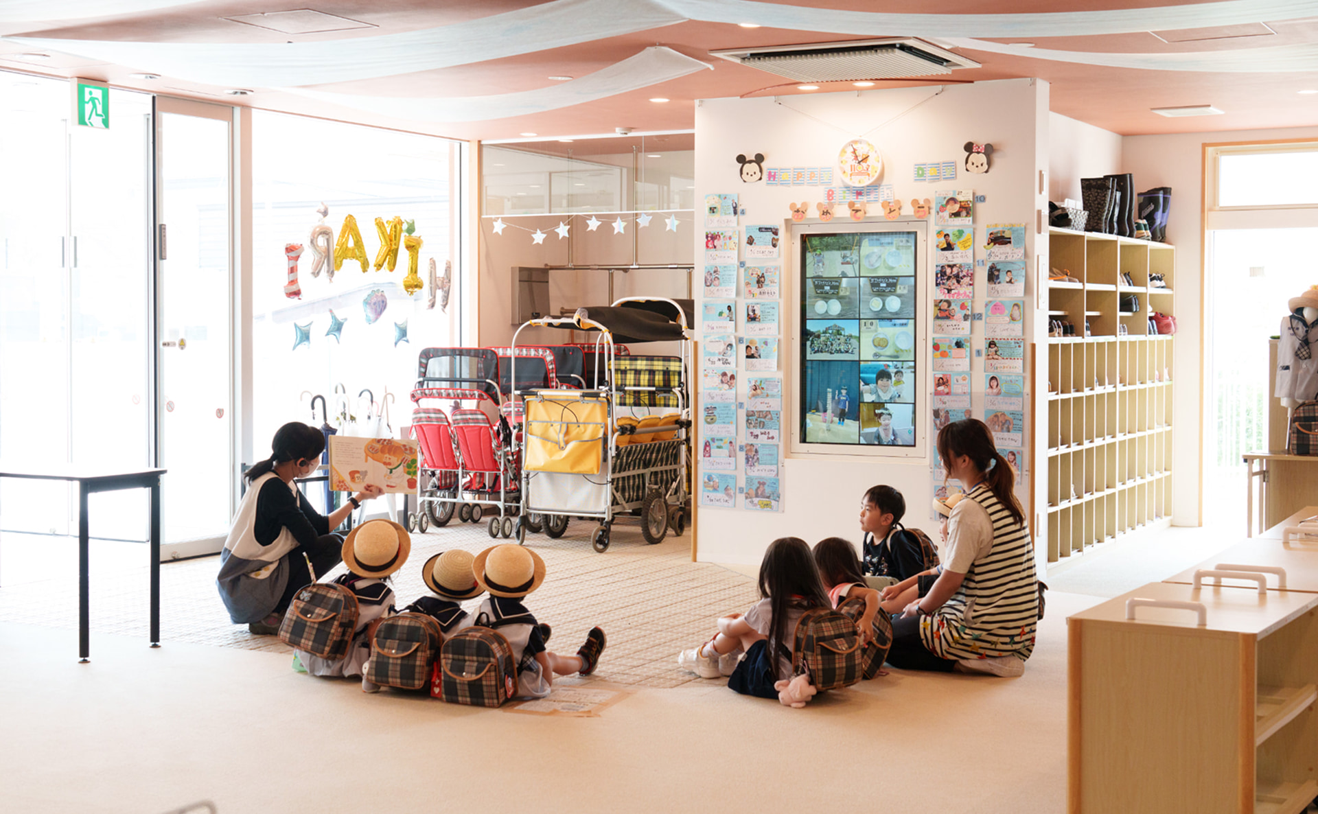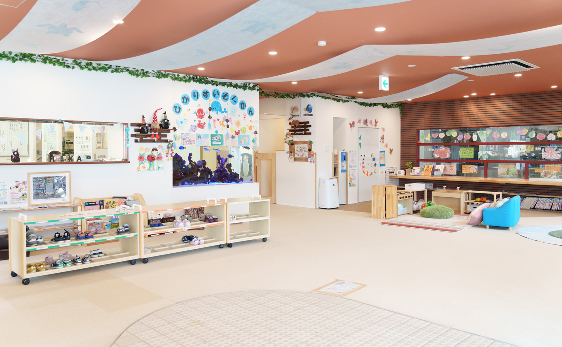 玄関を入るとすぐに開けたエントランスホールがあります。熱帯魚が泳ぐ水槽や、その日の様子の写真で見れる大型モニターがあり、エントランス中央は、厨房前のおままごとスペースになっています。ガラスで仕切られたキッチンは中の様子が見えるので、その様子を見ながらマネをしてあそんだり、キッチンの先生とコミュニケーションしたり、「ひかり」温かな雰囲気を感じられるエントランスです。