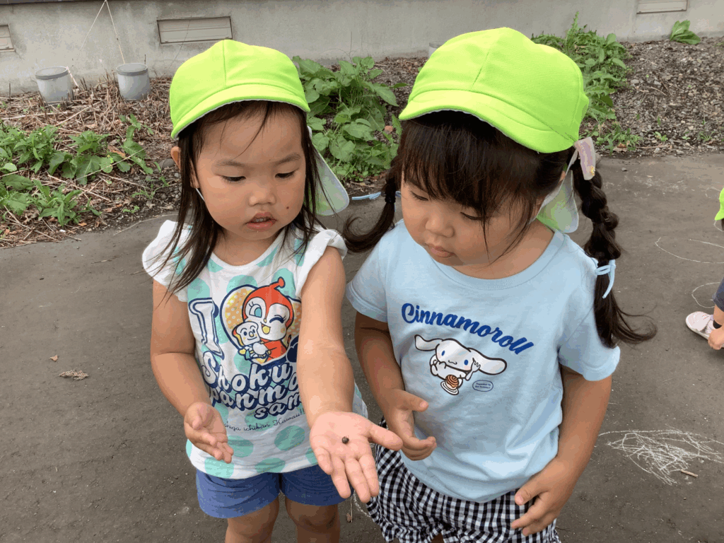 自分で好きなところに移動することができるようになった子どもたち。外あそびが大好きで興味津々、観察力が鋭く新たな発見を楽しんでいます。夏の水遊びを存分に満喫した今のブームは虫!!花などの自然物です。これからの季節はたくさんお散歩を楽しんでいきたいと思います。