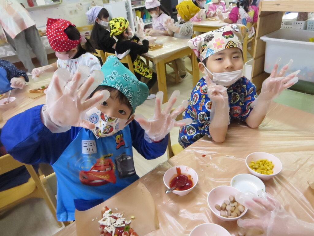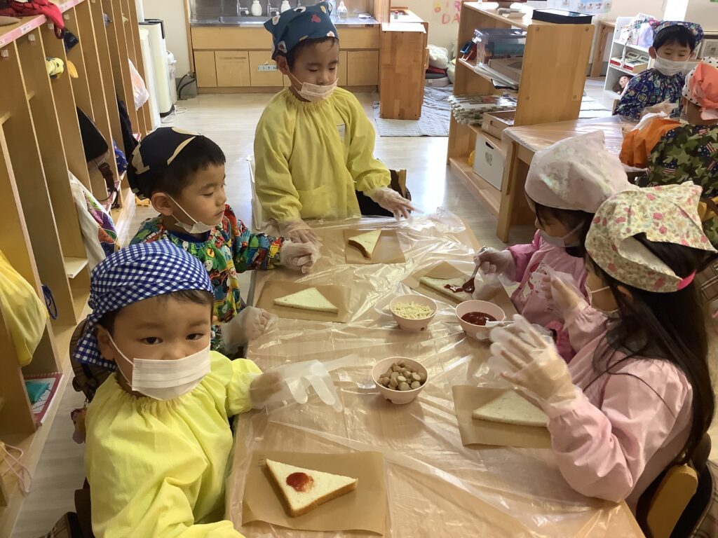 クッキングでは、食パンを三角に切り、ケチャップ・ピーマン・コーン・ウィンナー・チーズを使って 『自分だけのピザつくり』を行いました。