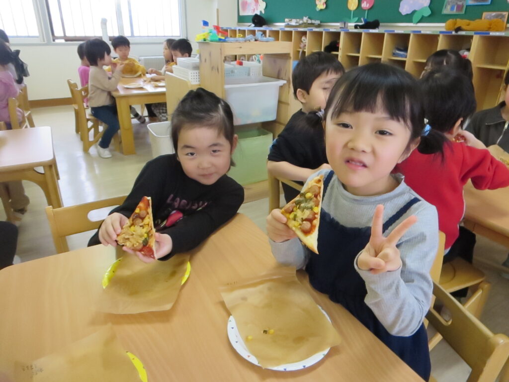 良い焼き色のピザは「美味しい!」という笑顔でみんな完食です。
