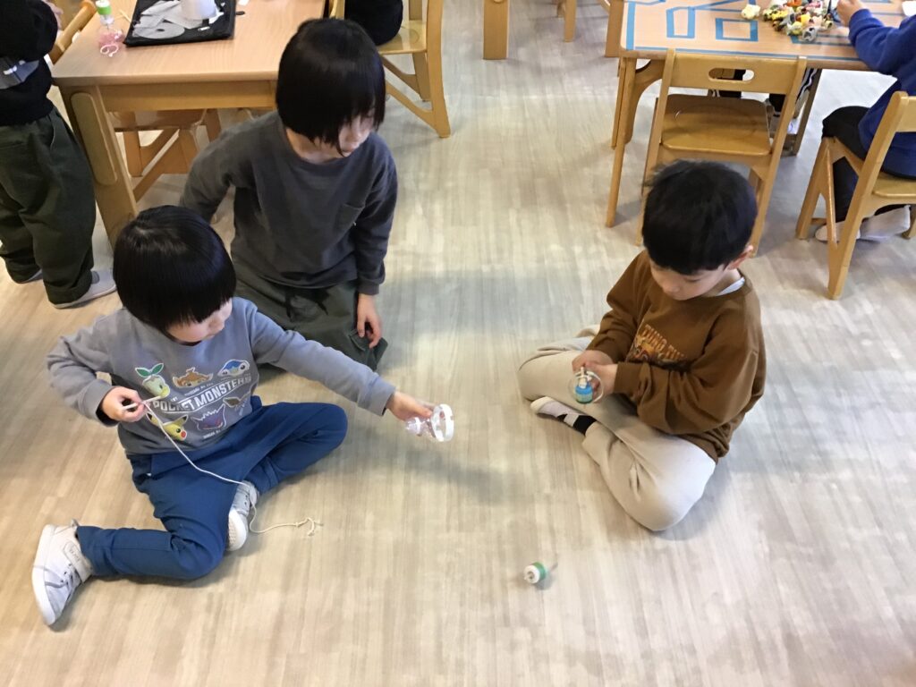 コマまわしにだるま落とし、けん玉、そのほかにもお手玉やたけとんぼにも挑戦!