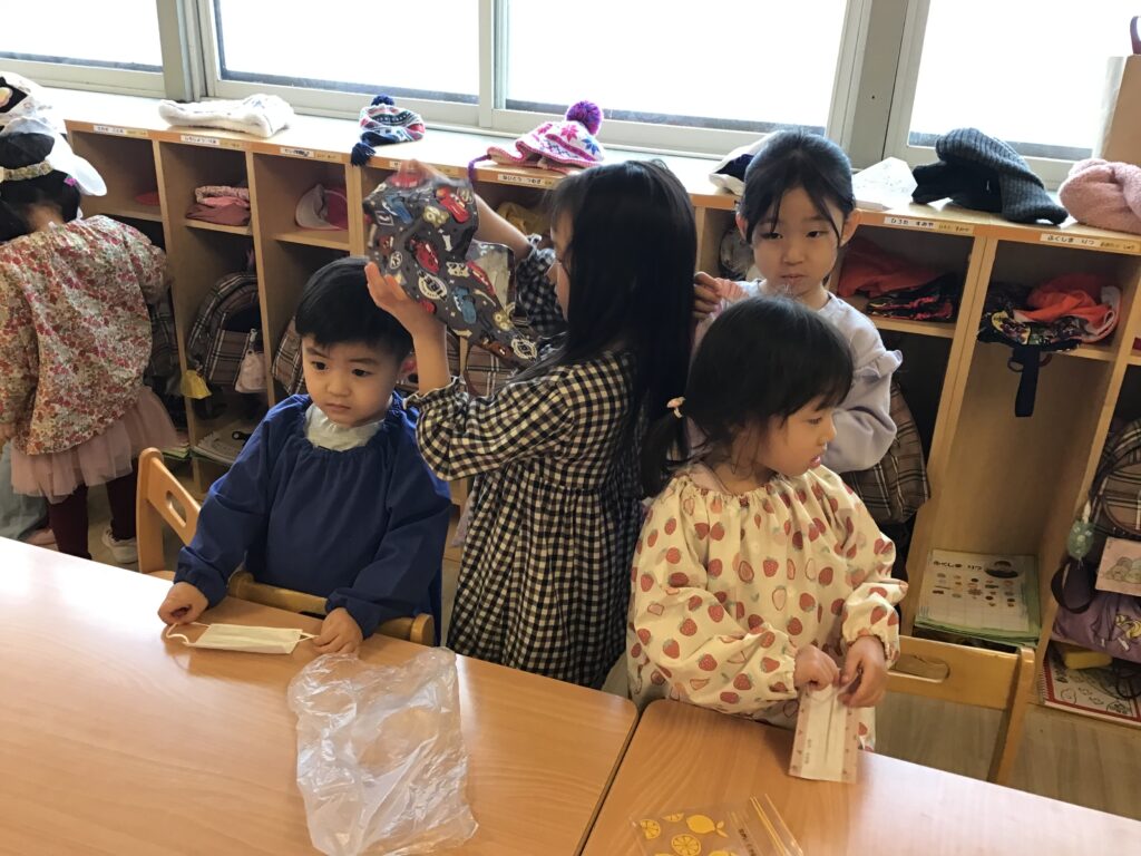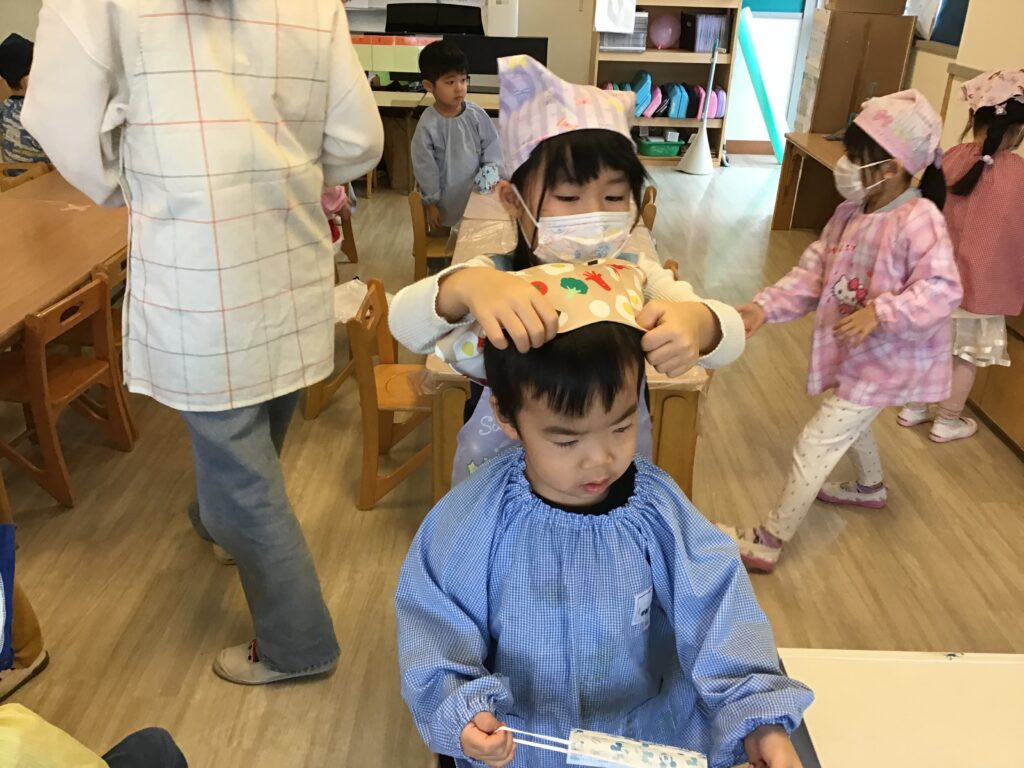 スモックや三角巾の準備では、5歳児さんが3歳児さんの準備を手伝う姿が見られ、微笑ましい関わりの場面も見られました。