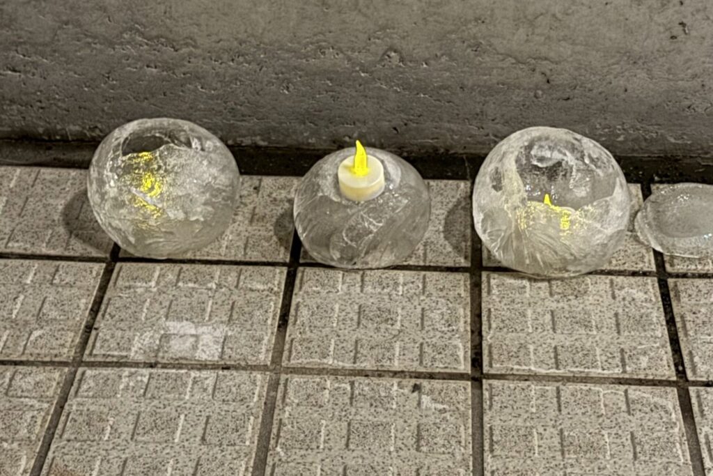 風船に水を入れ一晩凍らせた氷ではアイスキャンドルも作り玄関を装飾。