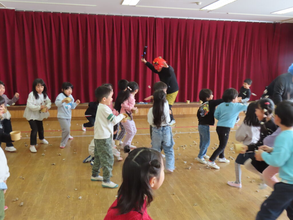 泣いてしまう子もいましたが、練習した「鬼は外、福は内」の掛け声を言いながら一生懸命豆をまいていた子どもたち。