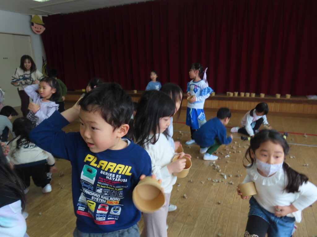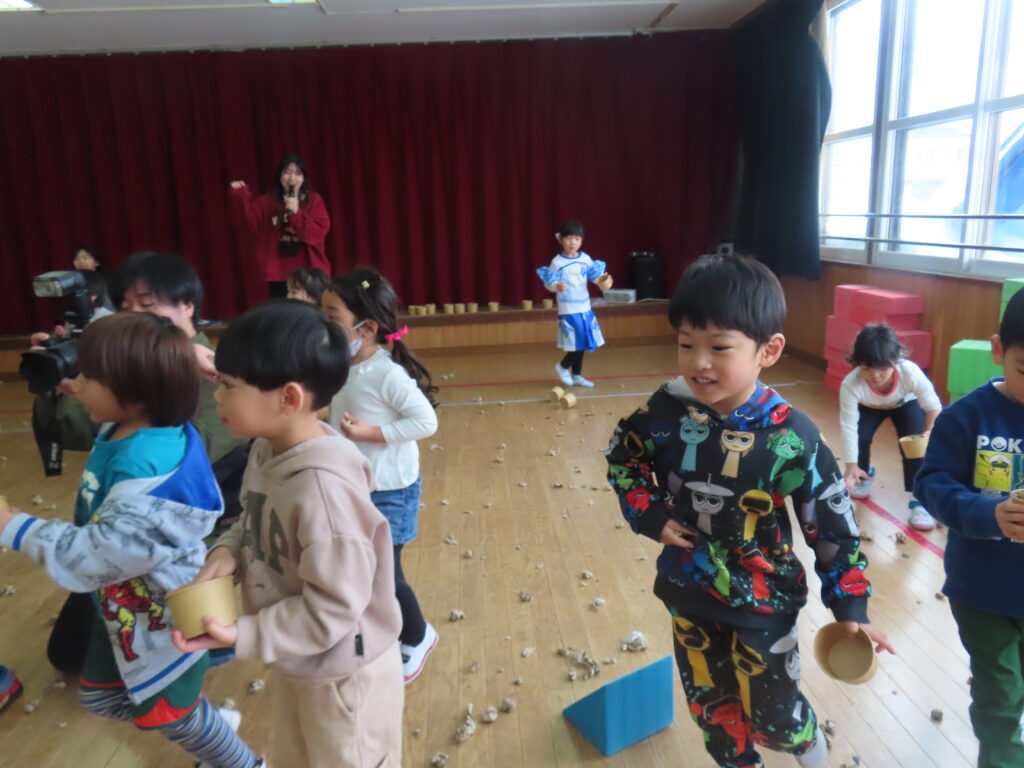 たちに豆を投げてもらいました。