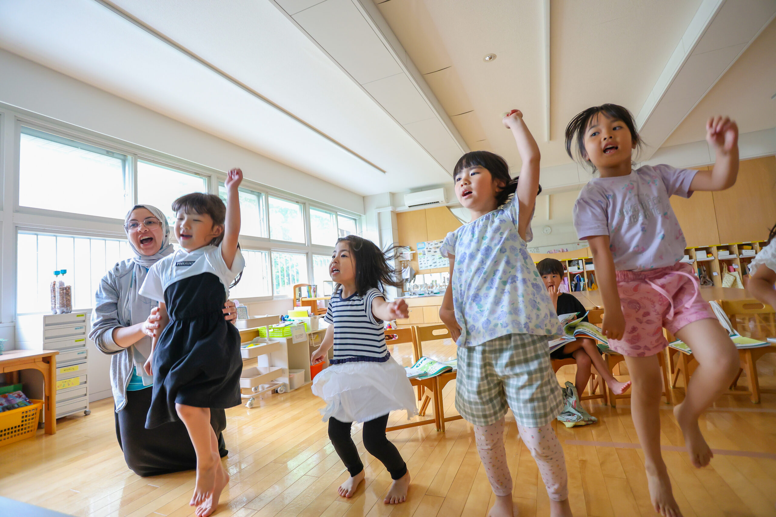 学園では2012年のスタート以来、20か国以上の方を先生として迎え、英語以外の言語や様々な風習に触れる機会を設けてきました。約1ヶ月間園に外国の先生が滞在し、子どもたちとって身近な食事・手あそび・歌などを教えてもらいます。新しい発見が多く、さまざまな「違い」を知る経験をとおして、多様性やコミュニケーション能力を育む貴重な機会になっています。