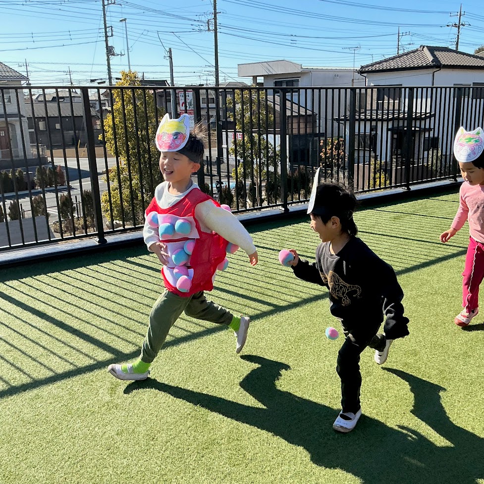 やりたいお友だちが順番に鬼となり、ペガーマンという競技を豆まきに見立てて楽しみました。