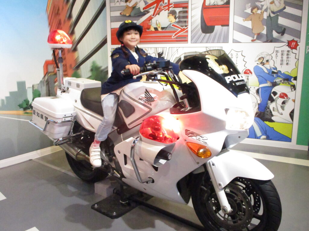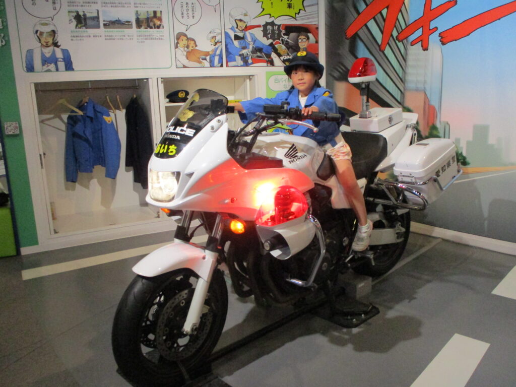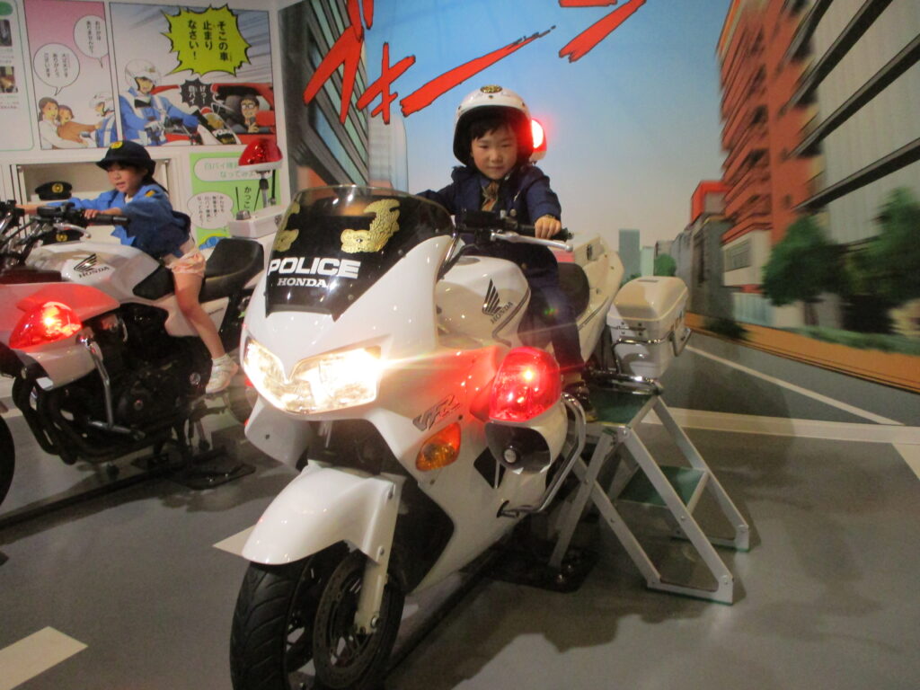 まず、制服を着て白バイに乗るコーナーでは、みんな初めての経験に大興奮でした。