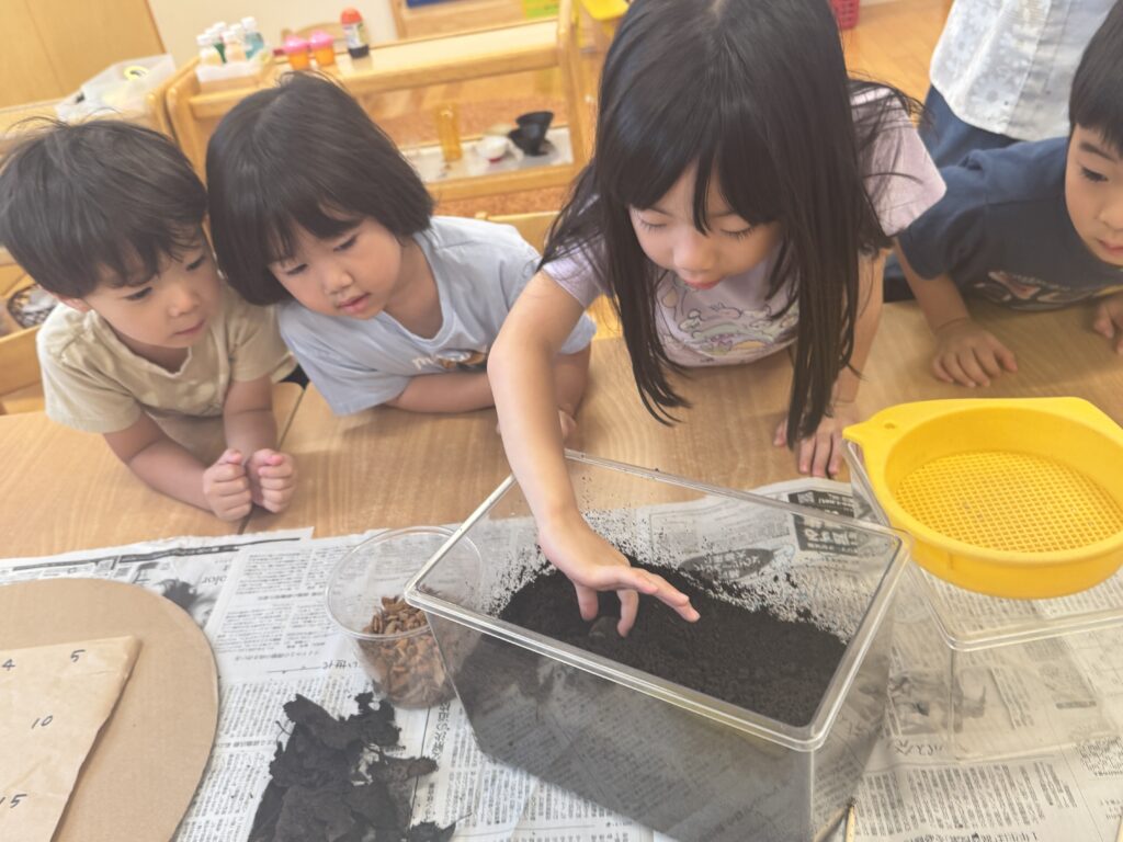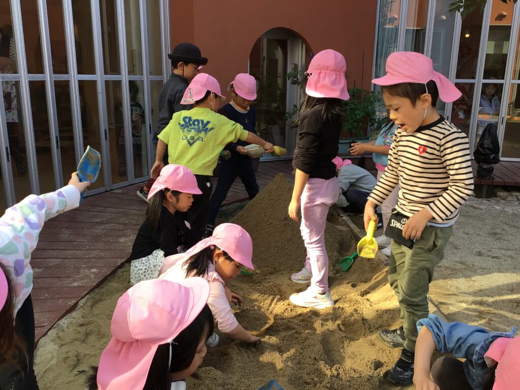 中庭の砂場遊びも高度になって、みんなで協力して大きな