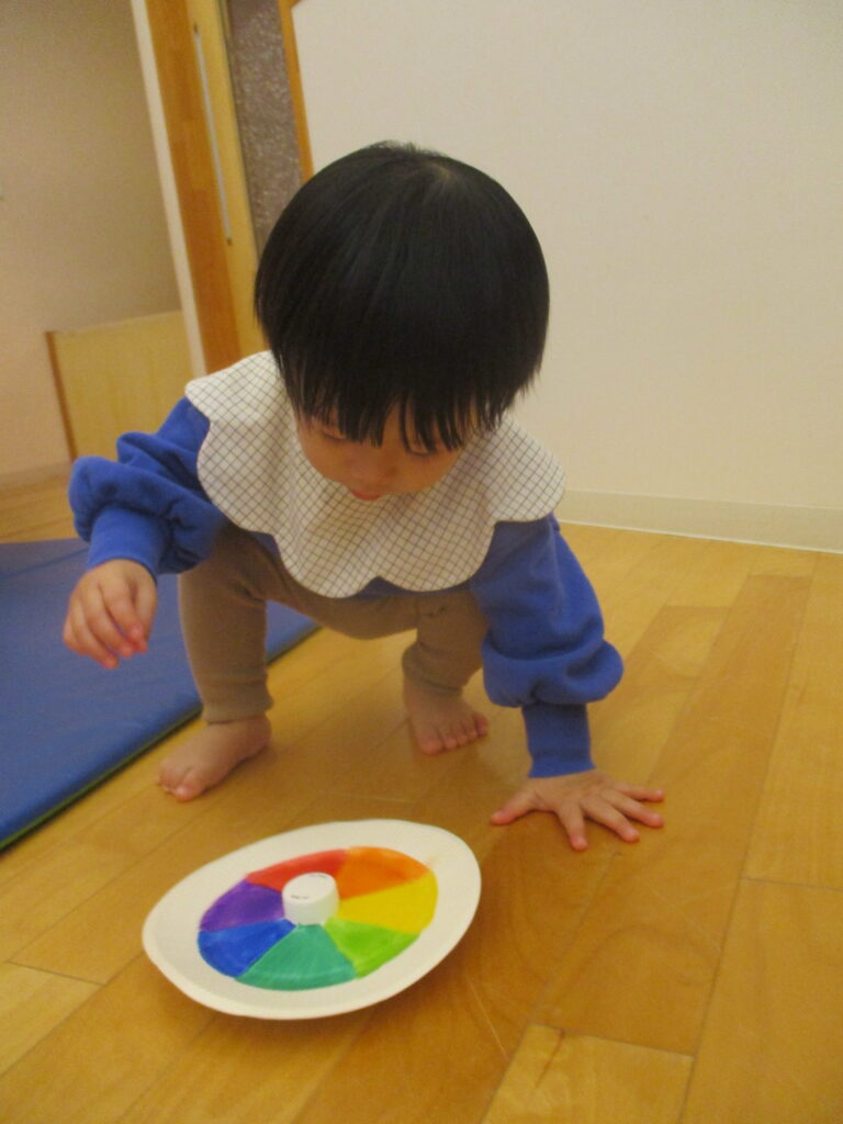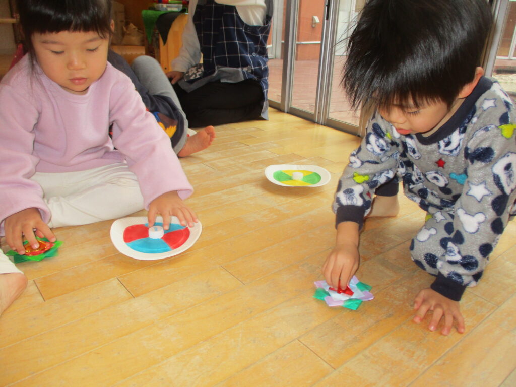 紙皿のコマは指先を使ってくるっと回すと簡単に回るので、すぐに達成感に繋がります😊
