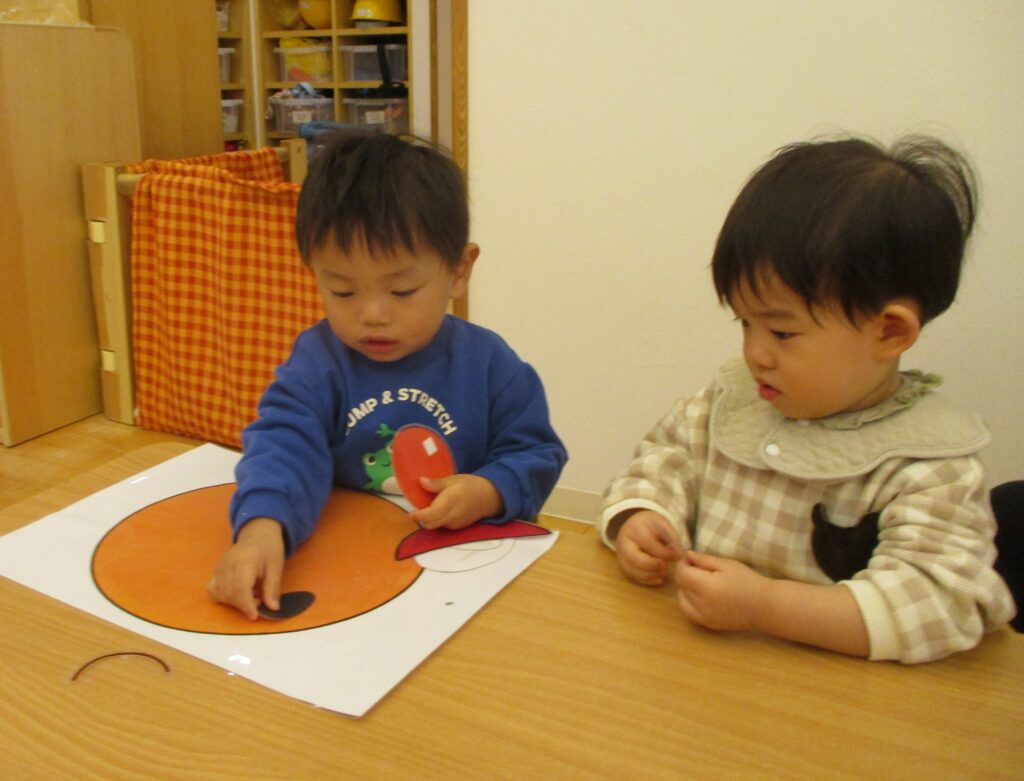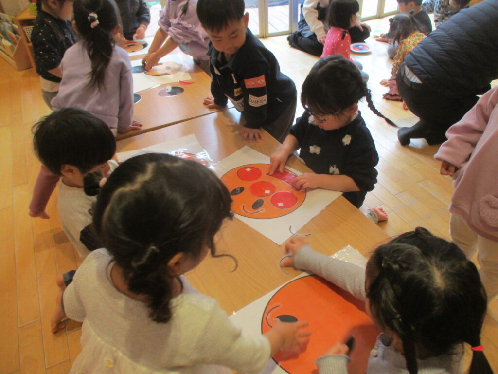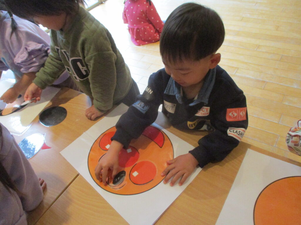 福笑いは顔の土台に目や口などのパーツを並べて完成!「できたよー♪」と持ち上げて見せてくれるので、ばさーっとパーツが落ちてしまってアレ?となる一幕もありましたが(笑)、笑顔いっぱいで楽しんでいました🎵