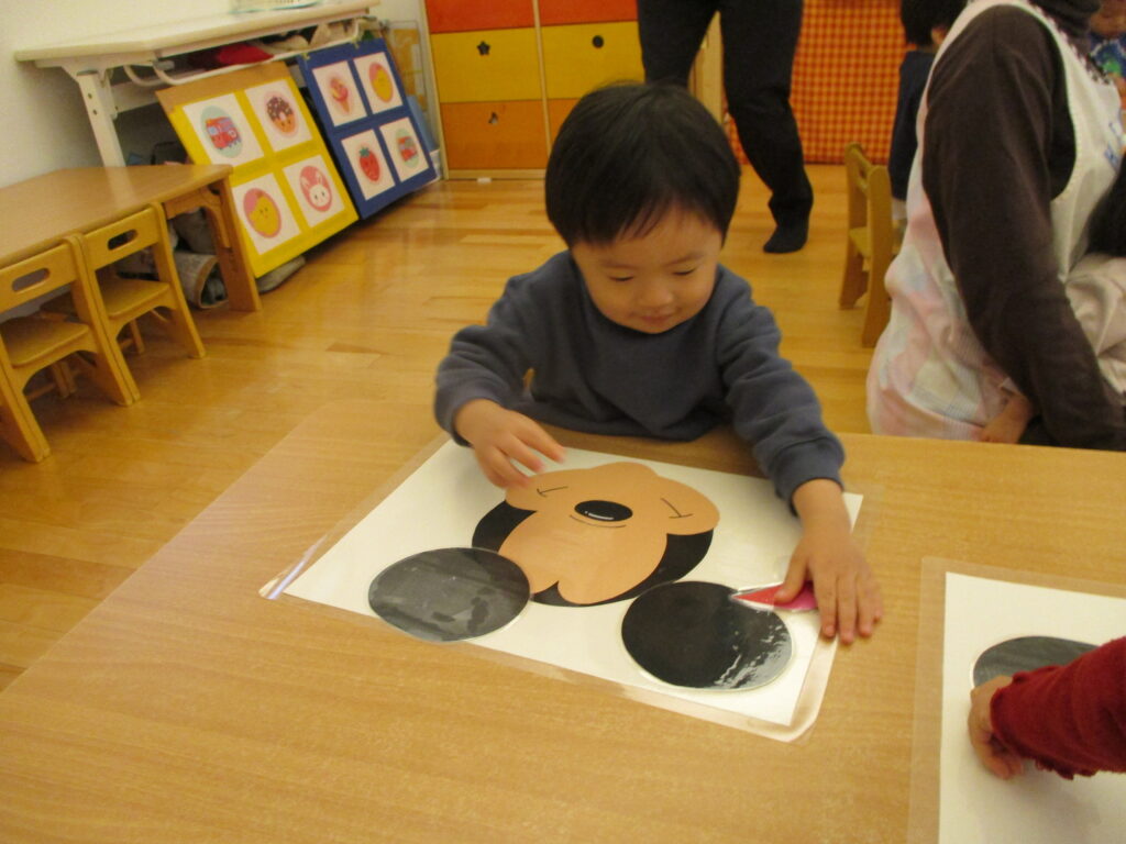 次は口を貼ってみようっと!耳ができてミッキーマウスらしさが出て嬉しそう😊