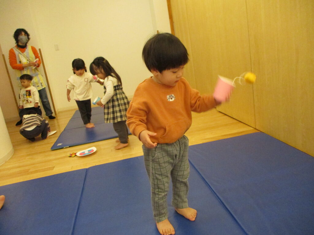紙コップのけん玉を勢いよく振って玉がコップに入ると「入ったよ!」と大喜び✨