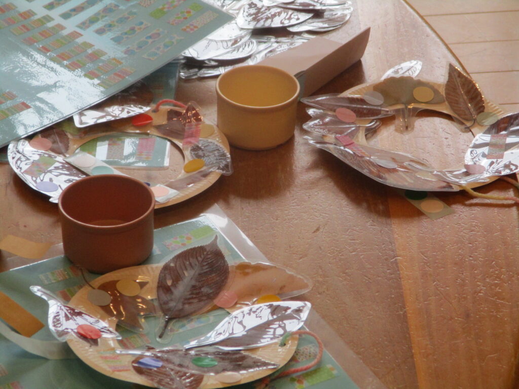 両面テープの付いた紙皿のリースに、ラミネートしてある葉っぱを