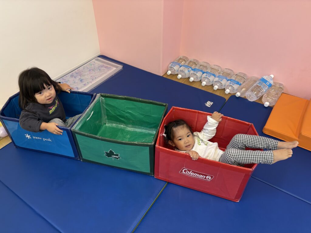 そんな子どもたちのあそびの姿から、保育者は牛乳パックで車作りました。れもん組大喜びです!上手に足で地面を押して部屋内を散歩をし、「ブッブ~」と言いながらバック駐車も上手です。大人気な車は、友だち同士の貸し借りで気持ちがぶつかることもありますが、仕草や言葉での気持ちの表し方を知っていったり、順番を待つ経験になっています。一人ひとりの「まだ使いたい」「今あそびたい」気持ちに寄り添いながら、どうしたら良いかを一緒に考えることを大切にしています。