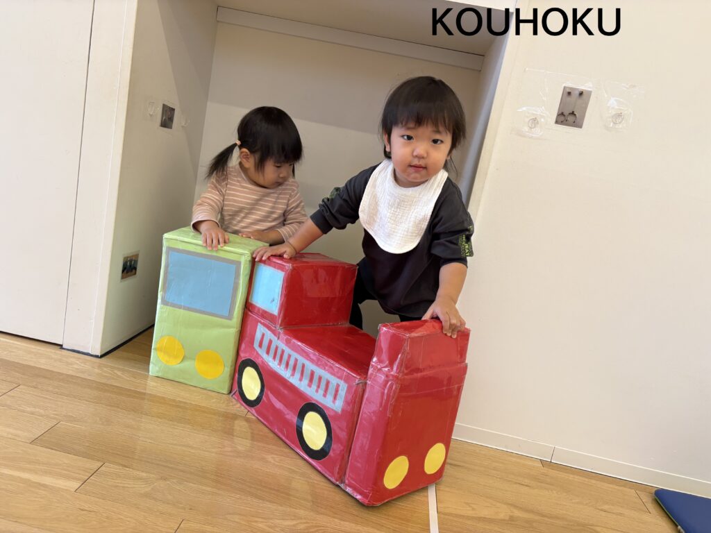 電車を部屋に置くと、「一緒に乗ろう~!」と友だちを誘って乗る仲良しなれもん組の子どもたちです☆