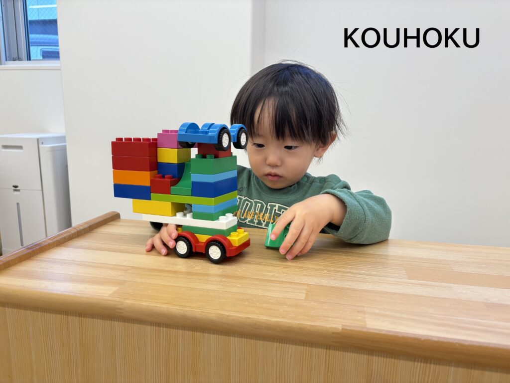 友だちの車を見て、「僕も同じ物を作りたい!」と真似をしたり、一緒にコースの上を走らせています。うまく組み立てられない時もありますが、考えて、試しながらあそぶことで、「できた!」の自信にも繋がり、日々成長を感じられるような作品を見せてくれます。